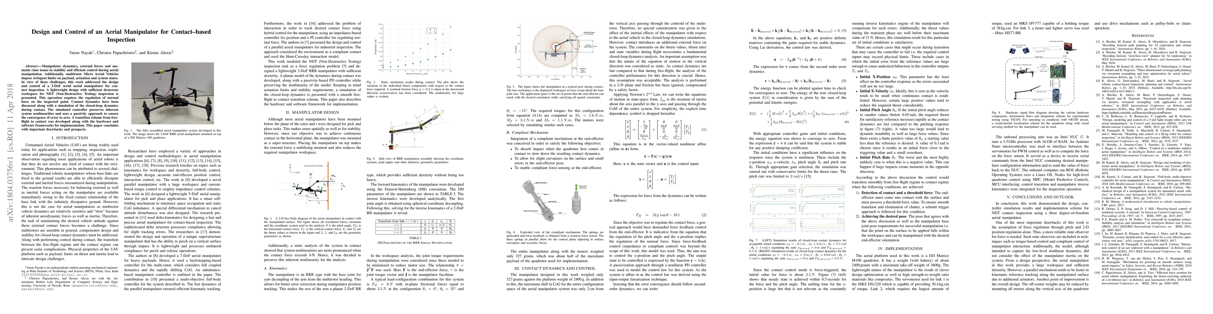 Manipulator dynamics, external forces and moments raise issues in stability and efficient control during aerial manipulation. Additionally, multirotor Micro Aerial Vehicles impose stringent limits on payload, actuation and system states. In view of these challenges, this work addressed the design and control of a 3-DoF serial aerial manipulator for contact inspection. A lightweight design with sufficient dexterous workspace for NDT (Non-Destructive Testing) inspection is presented. This operation requires the regulation of normal force on the inspected point. Contact dynamics have been discussed along with a simulation of the closed-loop dynamics during contact. The simulated controller preserves inherent system nonlinearities and uses a passivity approach to ensure the convergence of error to zero. A transition scheme from free-flight to contact was developed along with the hardware and software frameworks for implementation. This paper concludes with important drawbacks and prospects.