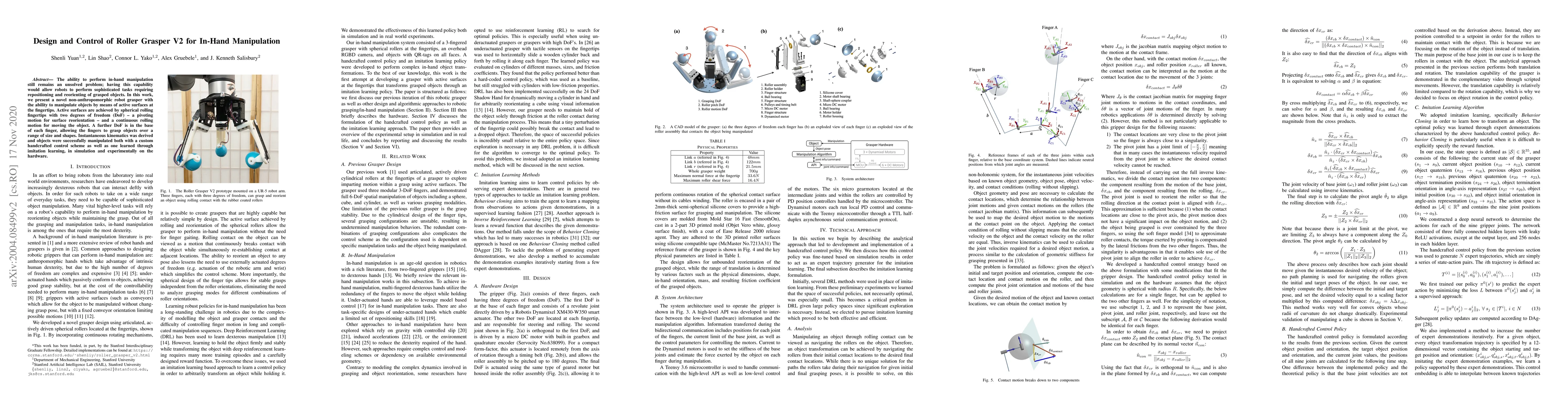 The ability to perform in-hand manipulation still remains an unsolved problem; having this capability would allow robots to perform sophisticated tasks requiring repositioning and reorienting of grasped objects. In this work, we present a novel non-anthropomorphic robot grasper with the ability to manipulate objects by means of active surfaces at the fingertips. Active surfaces are achieved by spherical rolling fingertips with two degrees of freedom (DoF) -- a pivoting motion for surface reorientation -- and a continuous rolling motion for moving the object. A further DoF is in the base of each finger, allowing the fingers to grasp objects over a range of size and shapes. Instantaneous kinematics was derived and objects were successfully manipulated both with a custom handcrafted control scheme as well as one learned through imitation learning, in simulation and experimentally on the hardware.