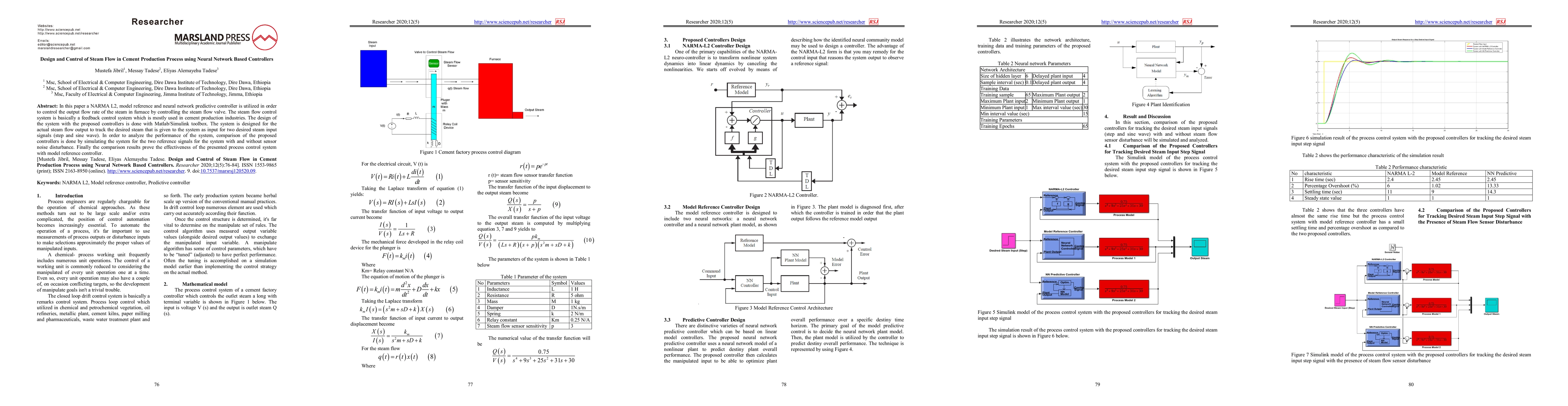 This paper proposes a neural network-based controller for controlling the steam flow rate in cement production, utilizing NARMA L2, model reference, and predictive control techniques. The system's performance is evaluated using MATLAB/Simulink, with comparisons showing the effectiveness of the proposed model reference controller under various conditions, including sensor noise.