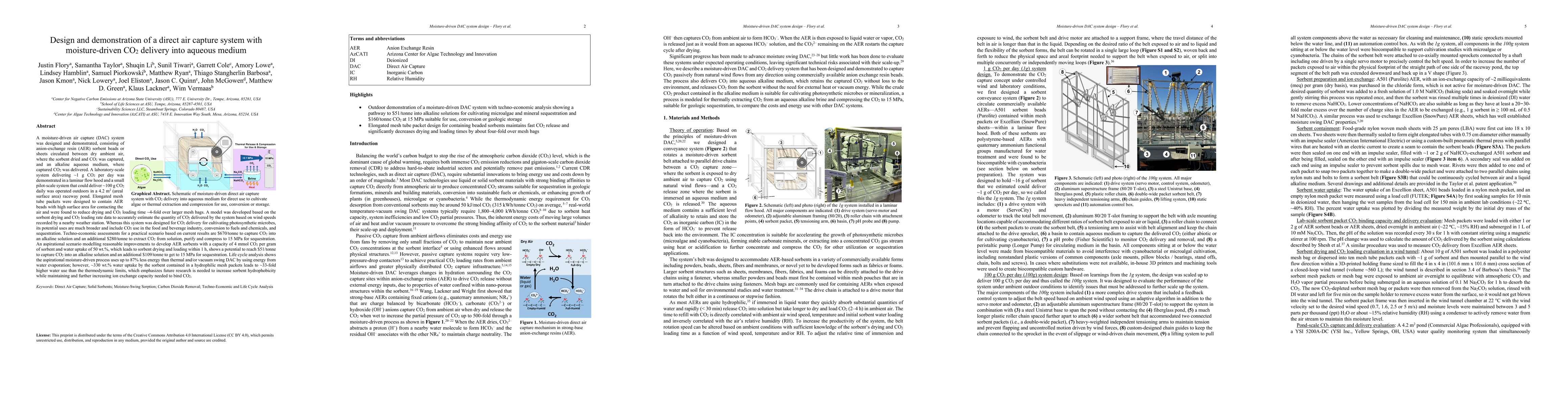 A moisture-driven air capture (DAC) system was designed and demonstrated. A laboratory-scale system delivering ~1 g CO2 per day was demonstrated in a laminar flow hood and a small pilot-scale system that could deliver ~100 g CO2 daily was operated outdoors in a 4.2 m2 (areal surface area) raceway pond. Elongated mesh tube packets were designed to contain AER beads with high surface area for contacting the air and were found to reduce drying and CO2 loading time ~4-fold over larger mesh bags. Whereas this system was designed for CO2 delivery for cultivating photosynthetic microbes, its potential uses are much broader and include CO2 use in the food and beverage industry, conversion to fuels and chemicals, and sequestration. Techno-economic assessments for a practical scenario based on current results are \$670/tonne to capture CO2 into an alkaline solution and an additional \$280/tonne to extract CO2 from solution, purify and compress to 15 MPa for sequestration. An aspirational scenario modelling reasonable improvements to develop AER sorbents with a capacity of 4 mmol CO2 per gram of sorbent and water uptake of 50 wt.%, which leads to sorbent drying and loading within 1 h, shows a potential to reach \$51/tonne to capture CO2 into an alkaline solution and an additional \$109/tonne to get to 15 MPa for sequestration. Life cycle analysis shows the aspirational moisture-driven process uses up to 87% less energy than thermal and/or vacuum swing DAC by using energy from water evaporation; however, ~330 wt.% water uptake by the sorbent contained in a hydrophilic mesh packets leads to ~33-fold higher water use than the thermodynamic limits, which emphasizes future research is needed to increase sorbent hydrophobicity while maintaining and further increasing ion exchange capacity needed to bind CO2.