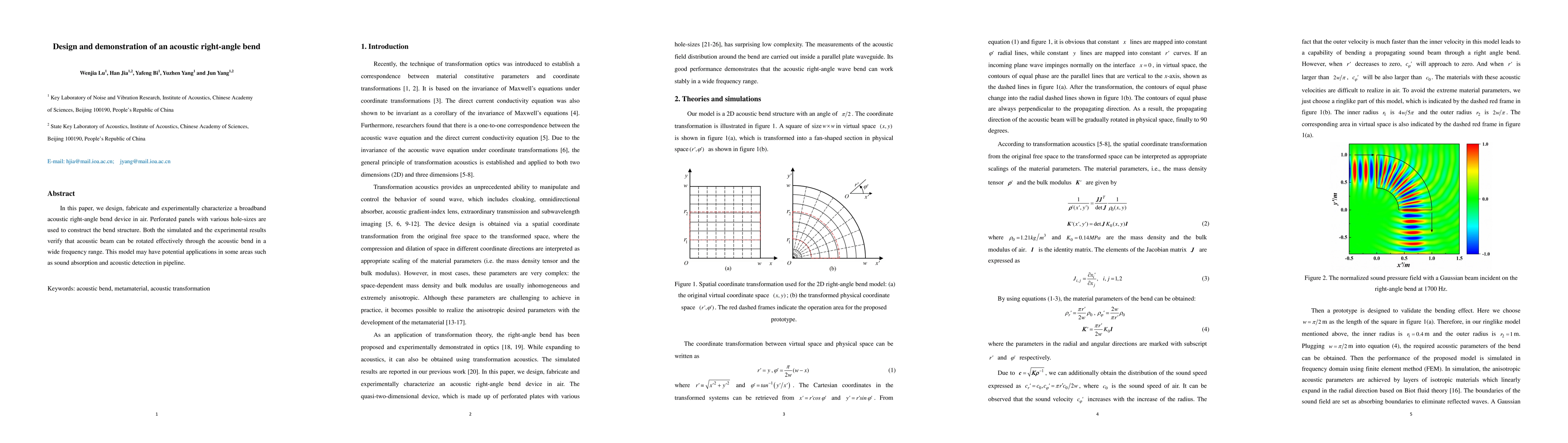 This paper presents the design and fabrication of a broadband acoustic right-angle bend device using perforated panels, which effectively rotates acoustic beams across a wide frequency range, with potential applications in sound absorption and acoustic detection. Experimental results confirm the device's effectiveness.