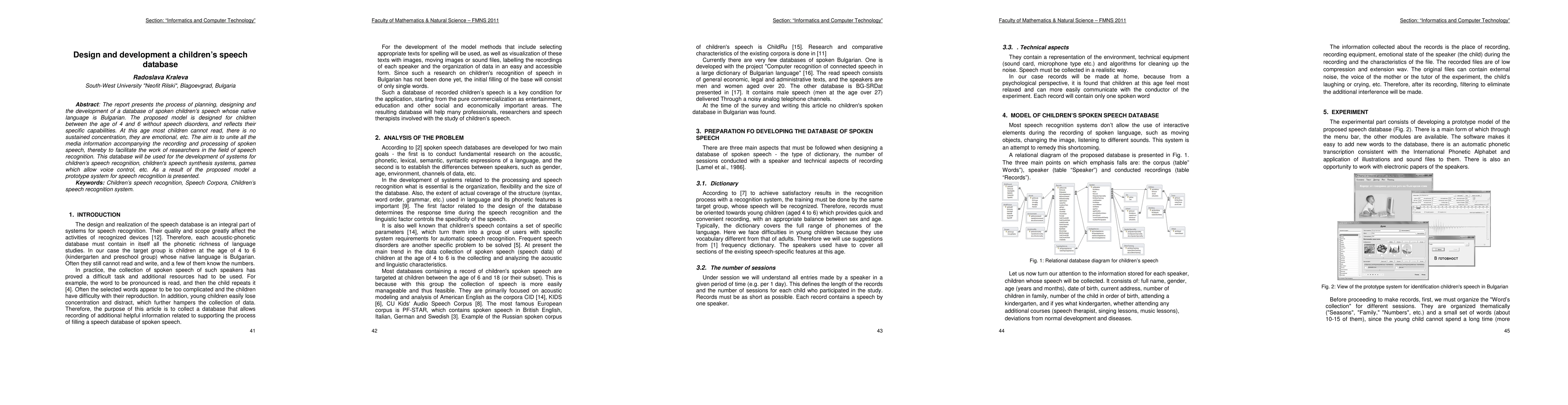 The report presents the process of planning, designing and the development of a database of spoken children's speech whose native language is Bulgarian. The proposed model is designed for children between the age of 4 and 6 without speech disorders, and reflects their specific capabilities. At this age most children cannot read, there is no sustained concentration, they are emotional, etc. The aim is to unite all the media information accompanying the recording and processing of spoken speech, thereby to facilitate the work of researchers in the field of speech recognition. This database will be used for the development of systems for children's speech recognition, children's speech synthesis systems, games which allow voice control, etc. As a result of the proposed model a prototype system for speech recognition is presented.