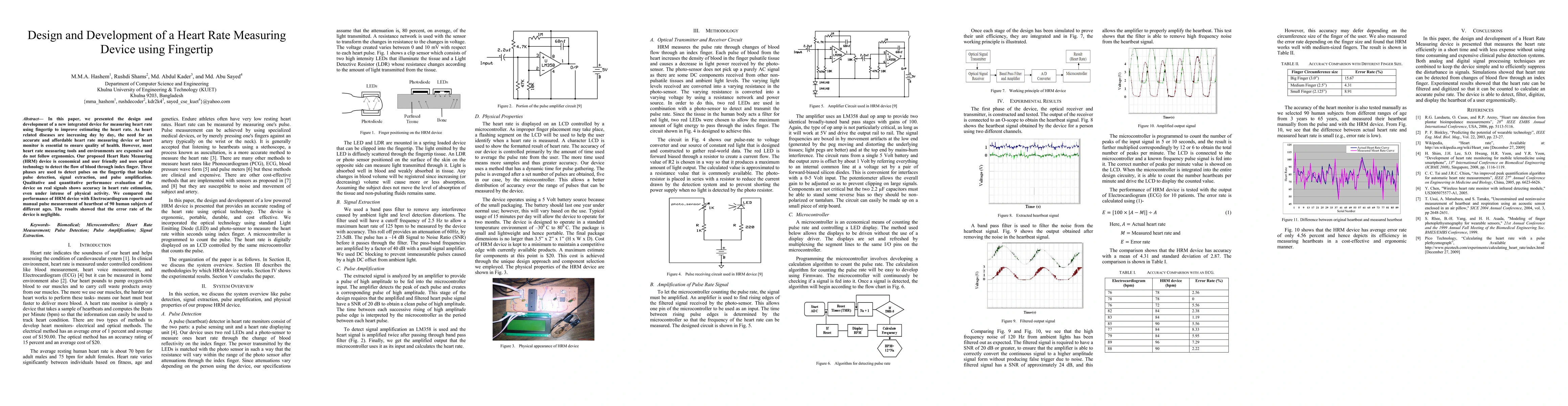 In this paper, we presented the design and development of a new integrated device for measuring heart rate using fingertip to improve estimating the heart rate. As heart related diseases are increasing day by day, the need for an accurate and affordable heart rate measuring device or heart monitor is essential to ensure quality of health. However, most heart rate measuring tools and environments are expensive and do not follow ergonomics. Our proposed Heart Rate Measuring (HRM) device is economical and user friendly and uses optical technology to detect the flow of blood through index finger. Three phases are used to detect pulses on the fingertip that include pulse detection, signal extraction, and pulse amplification. Qualitative and quantitative performance evaluation of the device on real signals shows accuracy in heart rate estimation, even under intense of physical activity. We compared the performance of HRM device with Electrocardiogram reports and manual pulse measurement of heartbeat of 90 human subjects of different ages. The results showed that the error rate of the device is negligible.