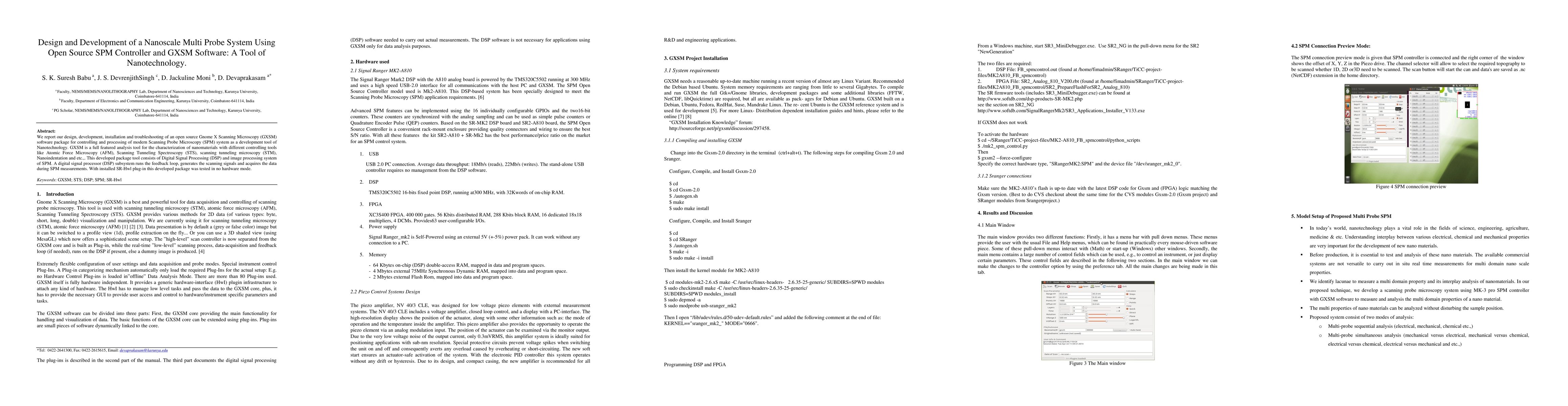 This paper details the design and development of an open-source nanoscale multi-probe system using GXSM software for controlling modern SPM systems, including AFM, STM, and Nanoindentation. The system integrates DSP and image processing for advanced nanomaterial characterization.