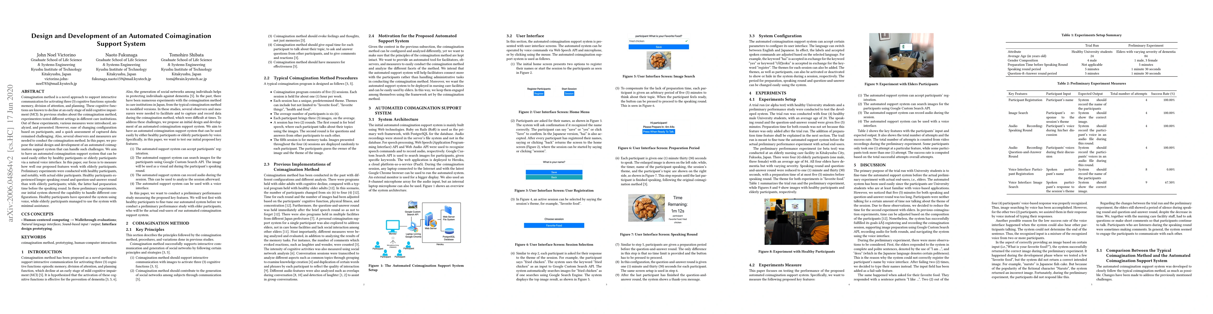 Coimagination method is a novel approach to support interactive communication for activating three (3) cognitive functions: episodic memory, division of attention, and planning. These cognitive functions are known to decline at an early stage of mild cognitive impairment (MCI). In previous studies about the coimagination method, experimenters tested different settings in different care institutions. Out of these experiments, various measures were introduced, analyzed, and presented. However, ease of changing configuration based on participants, and a quick assessment of captured data remained challenging. Also, several observers and measurers are needed to conduct the coimagination method. In this paper, we propose the initial design and development of an automated coimagination support system that can handle such challenges. We aim to have an automated coimagination support system that can be used easily either by healthy participants or elderly participants via a natural voice interface. In this paper, our focus is to measure how well our proposed features work with elderly participants. Preliminary experiments were conducted with healthy participants, and notably, with actual elder participants. Healthy participants experienced longer speaking round and question-and-answer round than with elderly participants; while, the latter had preparation time before the speaking round. In these preliminary experiments, our initial system showed the capability to handle different configurations. Healthy participants have operated the system using voice, while elderly participants managed to use the system with minimal assistance.