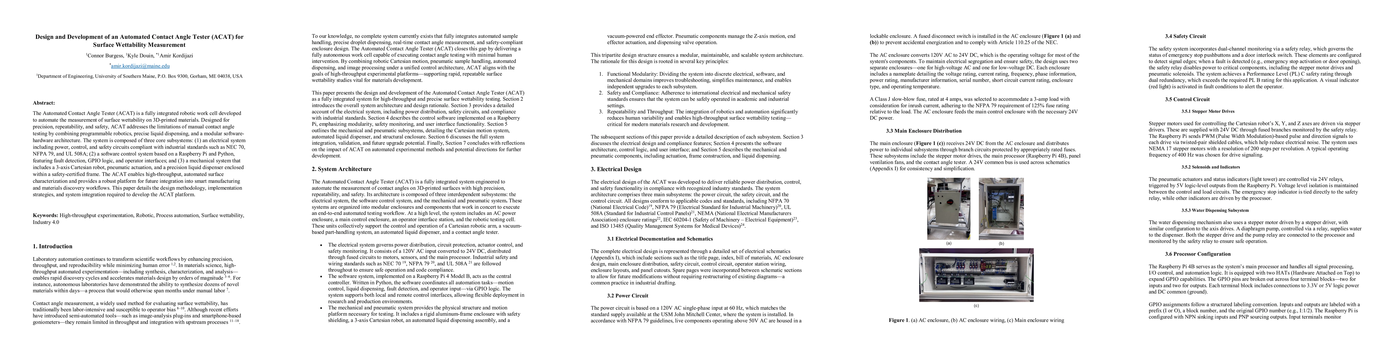 The Automated Contact Angle Tester (ACAT) is a fully integrated robotic work cell developed to automate the measurement of surface wettability on 3D-printed materials. Designed for precision, repeatability, and safety, ACAT addresses the limitations of manual contact angle testing by combining programmable robotics, precise liquid dispensing, and a modular software-hardware architecture. The system is composed of three core subsystems: (1) an electrical system including power, control, and safety circuits compliant with industrial standards such as NEC 70, NFPA 79, and UL 508A; (2) a software control system based on a Raspberry Pi and Python, featuring fault detection, GPIO logic, and operator interfaces; and (3) a mechanical system that includes a 3-axis Cartesian robot, pneumatic actuation, and a precision liquid dispenser enclosed within a safety-certified frame. The ACAT enables high-throughput, automated surface characterization and provides a robust platform for future integration into smart manufacturing and materials discovery workflows. This paper details the design methodology, implementation strategies, and system integration required to develop the ACAT platform.