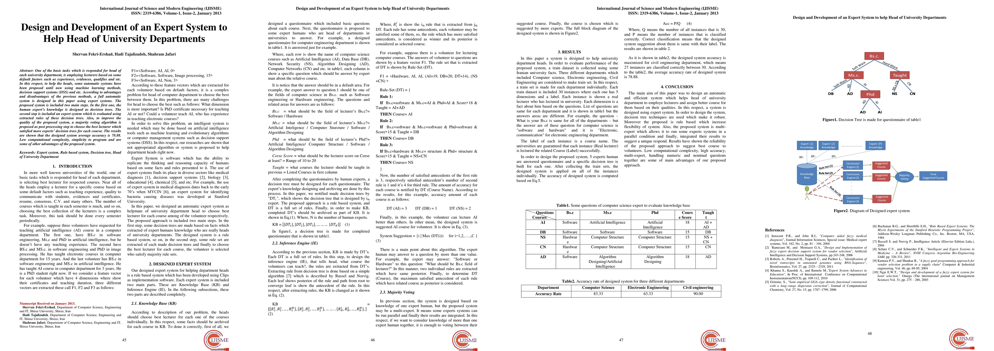 One of the basic tasks which is responded for head of each university department, is employing lecturers based on some default factors such as experience, evidences, qualifies and etc. In this respect, to help the heads, some automatic systems have been proposed until now using machine learning methods, decision support systems (DSS) and etc. According to advantages and disadvantages of the previous methods, a full automatic system is designed in this paper using expert systems. The proposed system is included two main steps. In the first one, the human expert's knowledge is designed as decision trees. The second step is included an expert system which is evaluated using extracted rules of these decision trees. Also, to improve the quality of the proposed system, a majority voting algorithm is proposed as post processing step to choose the best lecturer which satisfied more expert's decision trees for each course. The results are shown that the designed system average accuracy is 78.88. Low computational complexity, simplicity to program and are some of other advantages of the proposed system.