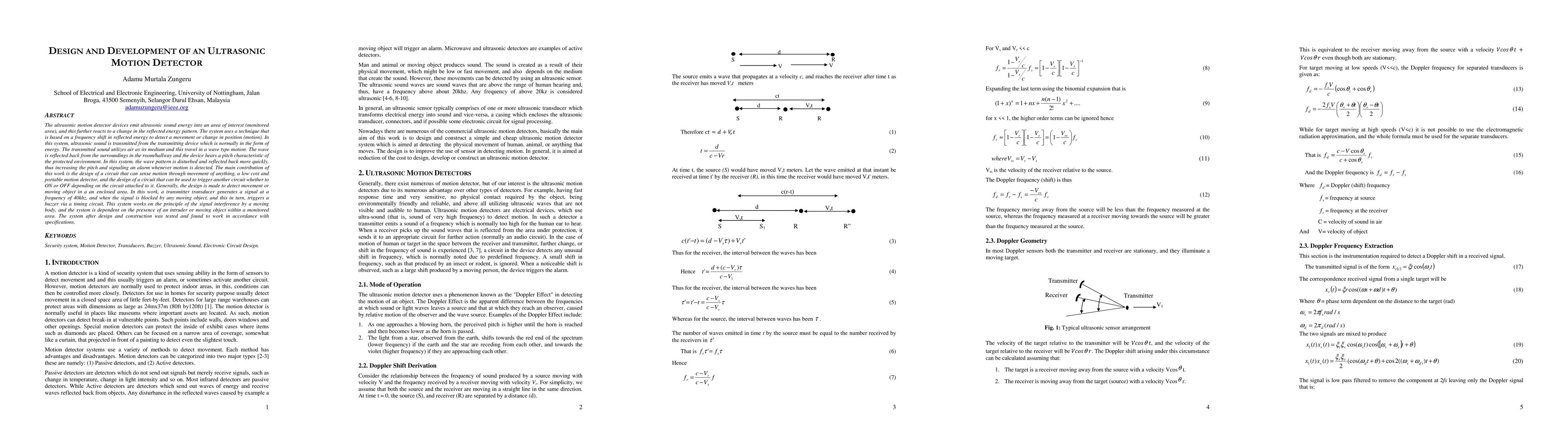 The ultrasonic motion detector devices emit ultrasonic sound energy into an area of interest (monitored area), and this further reacts to a change in the reflected energy pattern. The system uses a technique that is based on a frequency shift in reflected energy to detect a movement or change in position (motion). In this system, ultrasonic sound is transmitted from the transmitting device which is normally in the form of energy. The transmitted sound utilizes air as its medium and this travel in a wave type motion. The wave is reflected back from the surroundings in the room/hallway and the device hears a pitch characteristic of the protected environment. In this system, the wave pattern is disturbed and reflected back more quickly, thus increasing the pitch and signaling an alarm whenever motion is detected. The main contribution of this work is the design of a circuit that can sense motion through movement of anything, a low cost and portable motion detector, and the design of a circuit that can be used to trigger another circuit whether to ON or OFF depending on the circuit attached to it. Generally, the design is made to detect movement or moving object in a an enclosed area. In this work, a transmitter transducer generates a signal at a frequency of 40khz, and when the signal is blocked by any moving object, and this in turn, triggers a buzzer via a timing circuit. This system works on the principle of the signal interference by a moving body, and the system is dependent on the presence of an intruder or moving object within a monitored area. The system after design and construction was tested and found to work in accordance with specifications.