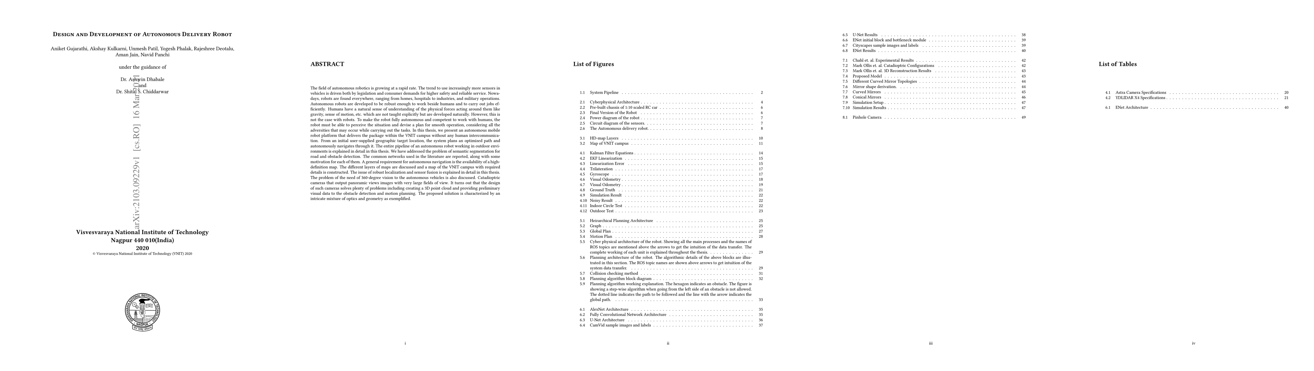 The field of autonomous robotics is growing at a rapid rate. The trend to use increasingly more sensors in vehicles is driven both by legislation and consumer demands for higher safety and reliable service. Nowadays, robots are found everywhere, ranging from homes, hospitals to industries, and military operations. Autonomous robots are developed to be robust enough to work beside humans and to carry out jobs efficiently. Humans have a natural sense of understanding of the physical forces acting around them like gravity, sense of motion, etc. which are not taught explicitly but are developed naturally. However, this is not the case with robots. To make the robot fully autonomous and competent to work with humans, the robot must be able to perceive the situation and devise a plan for smooth operation, considering all the adversities that may occur while carrying out the tasks. In this thesis, we present an autonomous mobile robot platform that delivers the package within the VNIT campus without any human intercommunication. From an initial user-supplied geographic target location, the system plans an optimized path and autonomously navigates through it. The entire pipeline of an autonomous robot working in outdoor environments is explained in detail in this thesis.