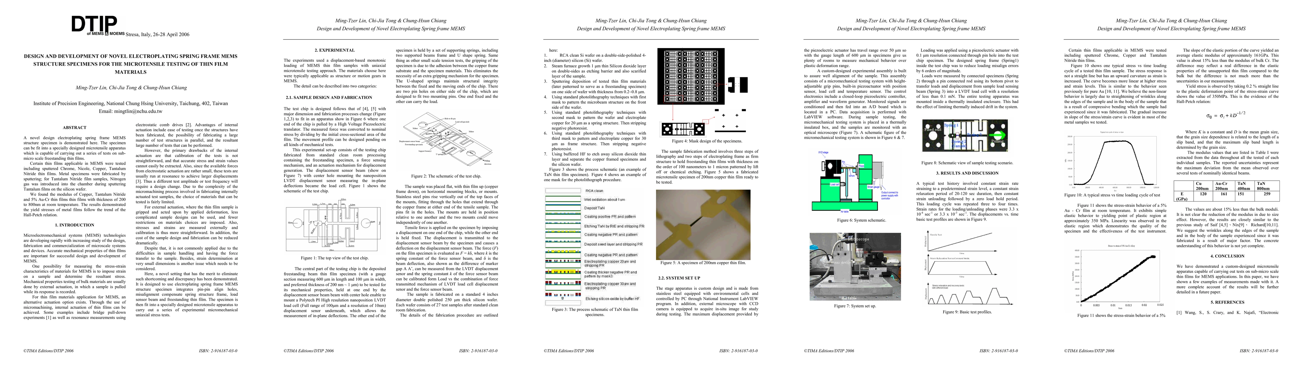 Microelectromechanical systems (MEMS) technologies are developing rapidly with increasing study of the design, fabrication and commercialization of microscale systems and devices. Accurate mechanical properties are important for successful design and development of MEMS. We have demonstrated here a novel electroplating spring frame MEMS Structure Specimen integrates pin-pin align holes, misalignment compensate spring structure frame, load sensor beam and freestanding thin film. The specimen can be fit into a specially designed microtensile apparatus which is capable of carrying out a series of tests on sub-micro scale freestanding thin films.