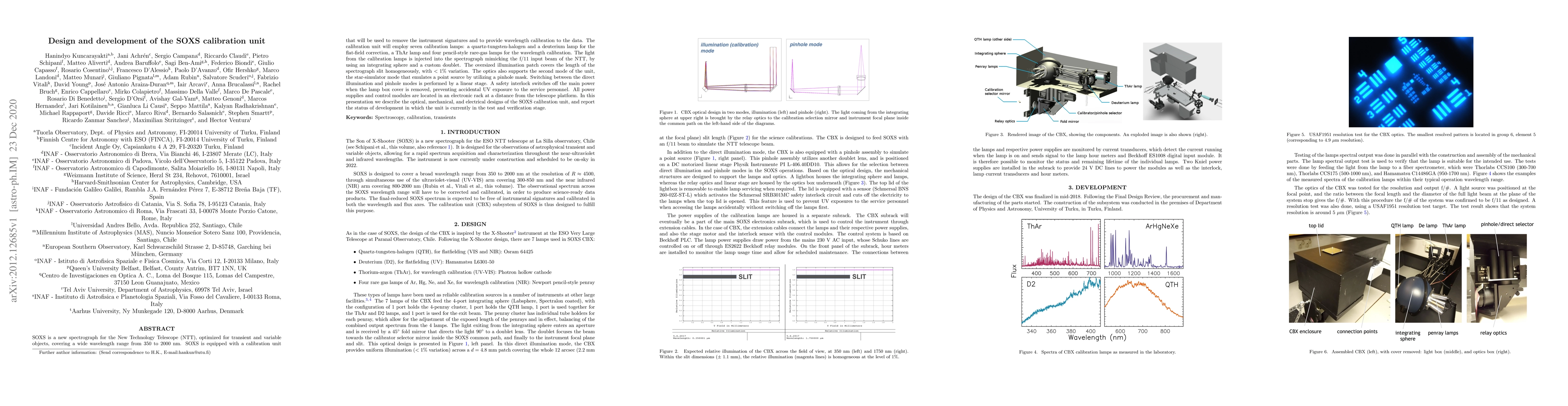The SOXS calibration unit for the New Technology Telescope's spectrograph employs seven lamps for flat-field and wavelength calibration, with an integrating sphere for uniform illumination. The unit is in the test phase, featuring safety interlocks and modular power supplies.