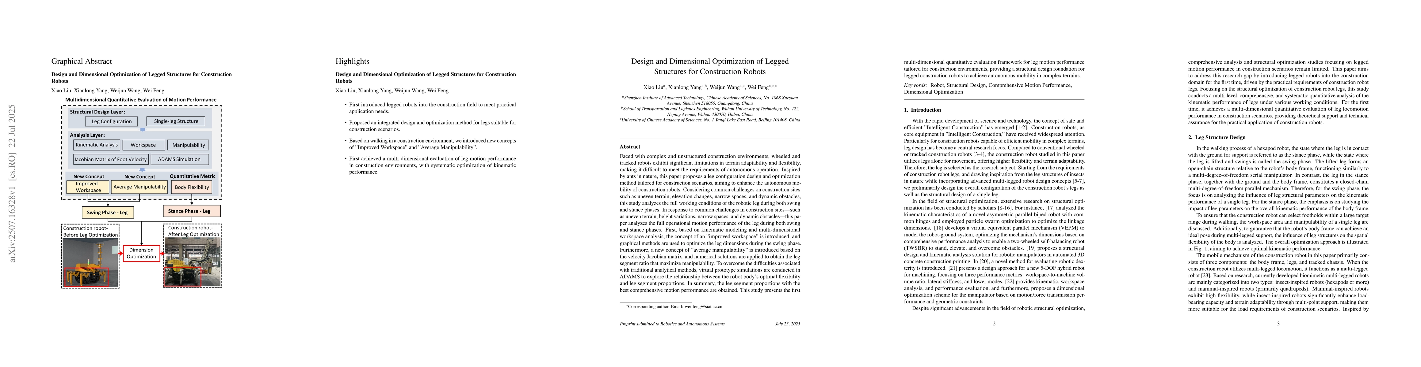 Faced with complex and unstructured construction environments, wheeled and tracked robots exhibit significant limitations in terrain adaptability and flexibility, making it difficult to meet the requirements of autonomous operation. Inspired by ants in nature, this paper proposes a leg configuration design and optimization method tailored for construction scenarios, aiming to enhance the autonomous mobility of construction robots. This paper analyzes the full operational motion performance of the leg during both swing and stance phases. First, based on kinematic modeling and multi-dimensional workspace analysis, the concept of an "improved workspace" is introduced, and graphical methods are used to optimize the leg dimensions during the swing phase. Furthermore, a new concept of "average manipulability" is introduced based on the velocity Jacobian matrix, and numerical solutions are applied to obtain the leg segment ratio that maximizes manipulability. To overcome the difficulties associated with traditional analytical methods, virtual prototype simulations are conducted in ADAMS to explore the relationship between the robot body's optimal flexibility and leg segment proportions. In summary, the leg segment proportions with the best comprehensive motion performance are obtained. This study presents the first multi-dimensional quantitative evaluation framework for leg motion performance tailored for construction environments, providing a structural design foundation for legged construction robots to achieve autonomous mobility in complex terrains.