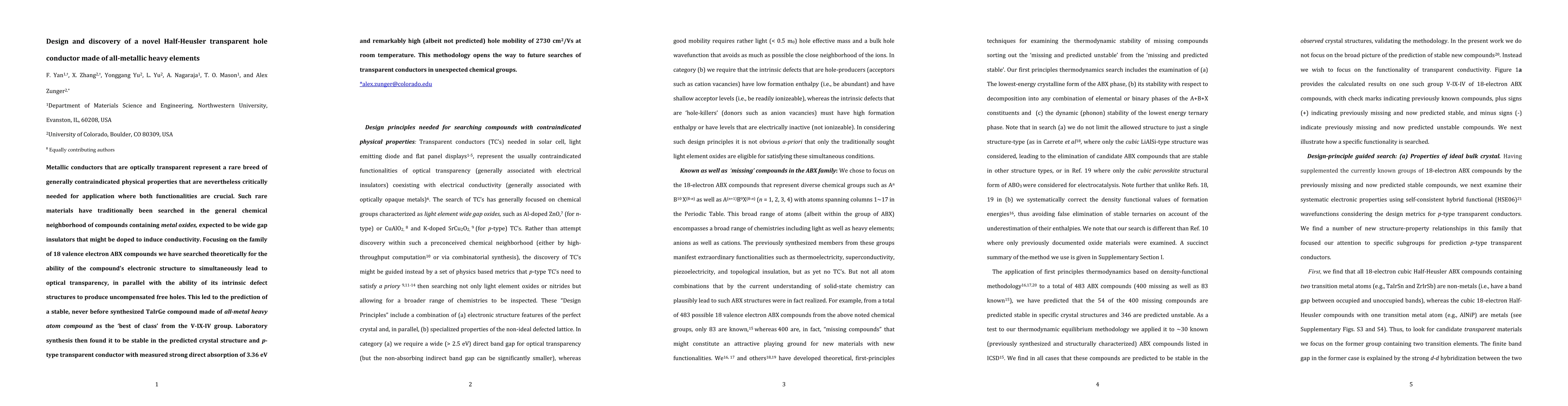 Researchers discovered a novel transparent hole conductor, TaIrGe, composed entirely of metallic heavy elements, balancing optical transparency and p-type conductivity. The compound exhibits strong direct absorption and high hole mobility, suggesting a new approach for finding similar materials in unexpected chemical groups.