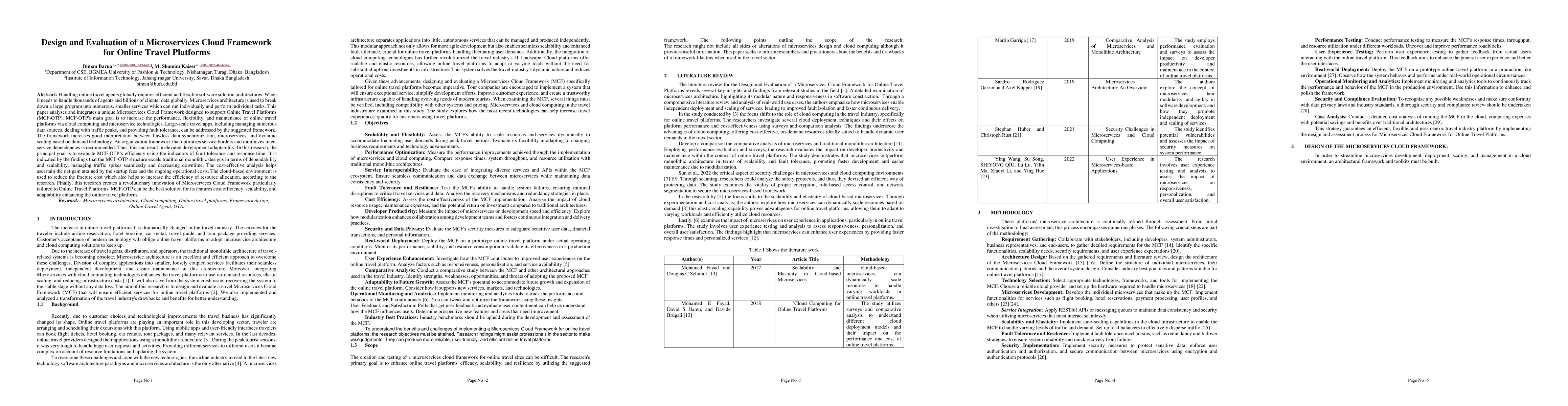 The paper presents a Microservices Cloud Framework (MCF-OTP) designed for online travel platforms, focusing on enhancing performance, flexibility, and maintenance through cloud computing and microservice technologies.
