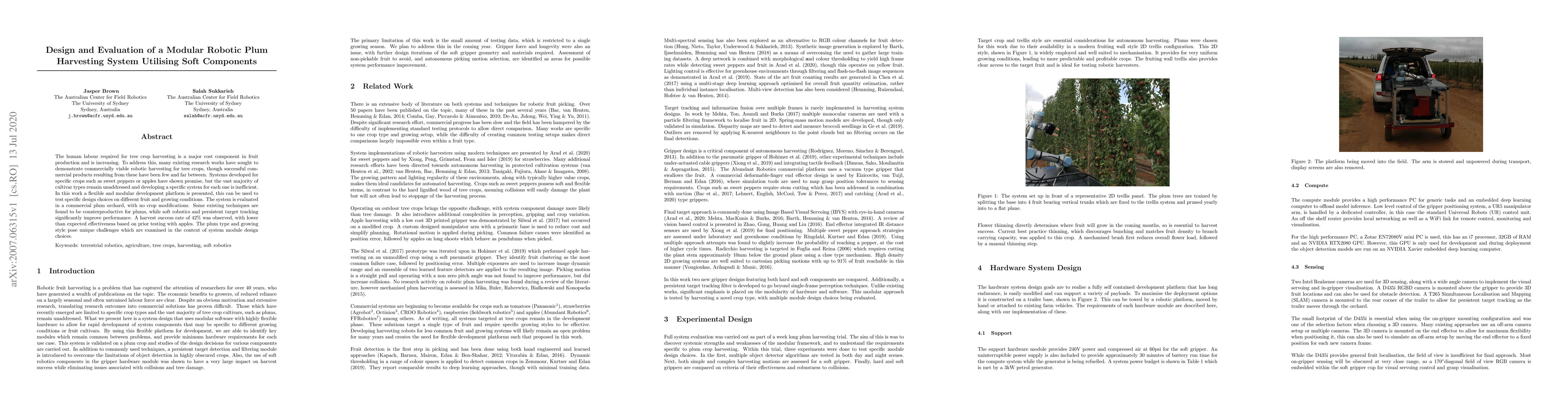 A modular robotic harvesting system was designed to test on various fruit types with soft robotics and persistent target tracking improving performance in a commercial plum orchard, achieving a 42% harvest success rate.