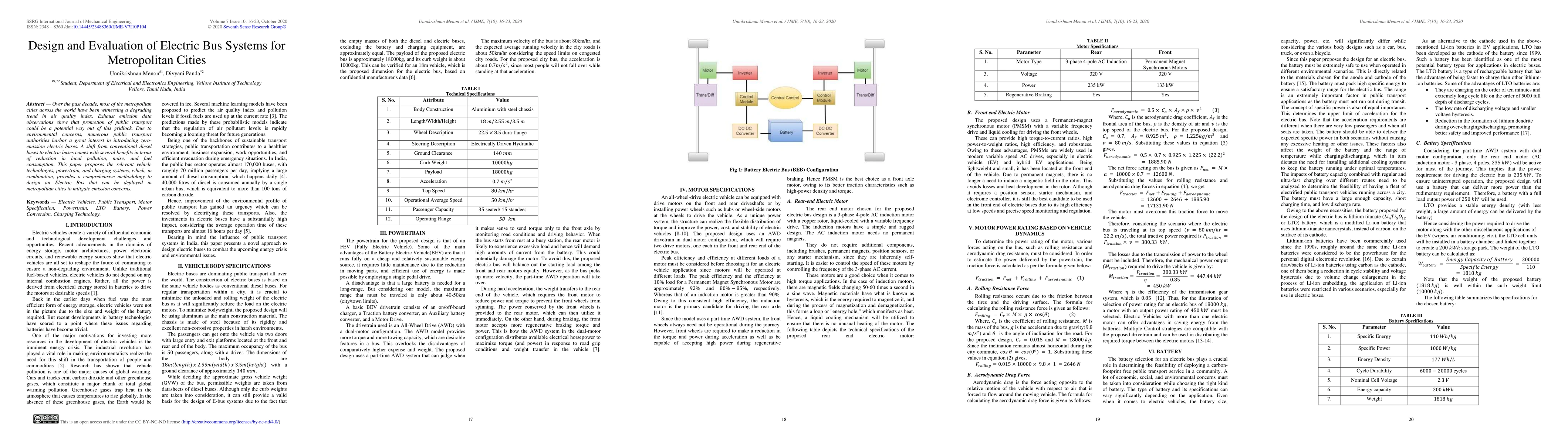 Over the past decade, most of the metropolitan cities across the world have been witnessing a degrading trend in air quality index. Exhaust emission data observations show that promotion of public transport could be a potential way out of this gridlock. Due to environmental concerns, numerous public transport authorities harbor a great interest in introducing zero emission electric buses. A shift from conventional diesel buses to electric buses comes with several benefits in terms of reduction in local pollution, noise, and fuel consumption. This paper proposes the relevant vehicle technologies, powertrain, and charging systems, which, in combination, provides a comprehensive methodology to design an Electric Bus that can be deployed in metropolitan cities to mitigate emission concerns.