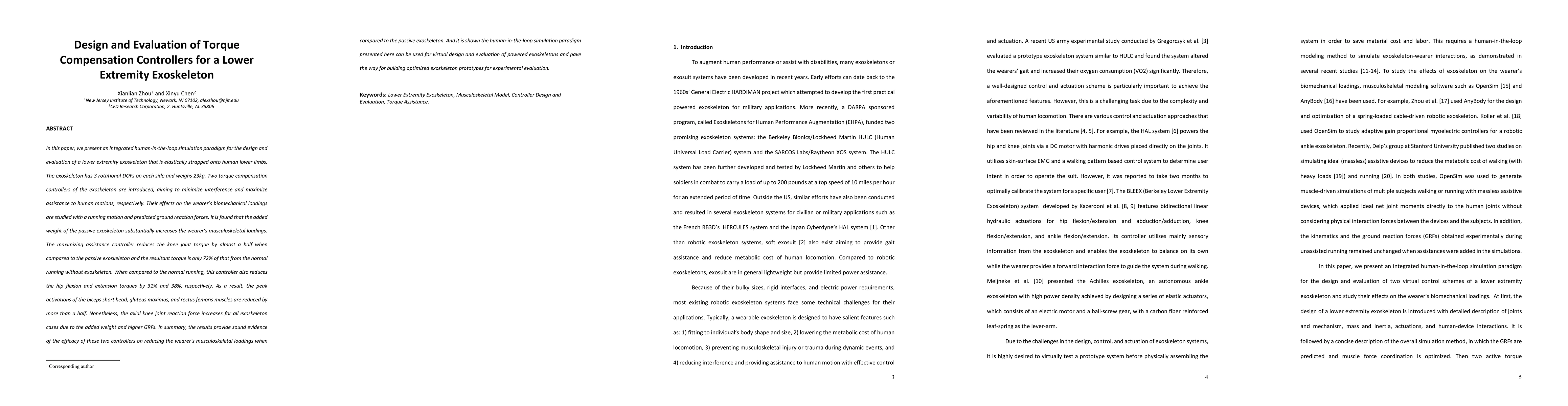 This paper designs and evaluates torque compensation controllers for a lower extremity exoskeleton, finding that the maximizing assistance controller significantly reduces knee, hip joint torques, and muscle activations by up to 50%, while the exoskeleton's weight still increases axial knee joint reaction forces. The study highlights the efficacy of the controllers and the utility of the human-in-the-loop simulation paradigm for future exoskeleton design.