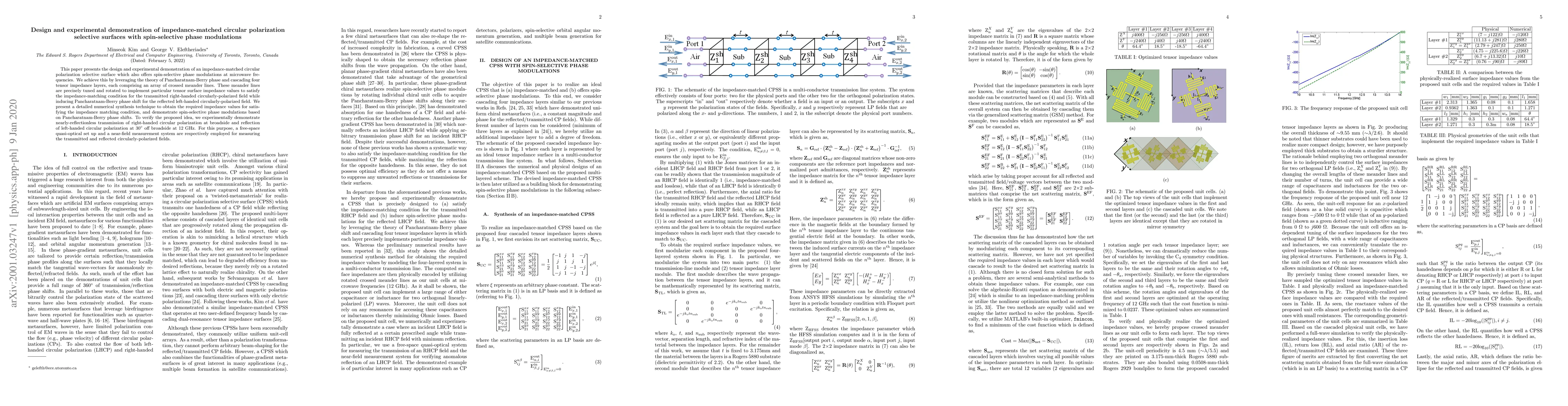 This paper presents the design and experimental demonstration of an impedance-matched circular polarization selective surface which also offers spin-selective phase modulations at microwave frequencies. We achieve this by leveraging the theory of Pancharatnam-Berry phase and cascading four tensor impedance layers, each comprising an array of crossed meander lines. These meander lines are precisely tuned and rotated to implement particular tensor surface impedance values to satisfy the impedance-matching condition for the transmitted right-handed circularly-polarized field while inducing Pancharatnam-Berry phase shift for the reflected left-handed circularly-polarized field. We present a detailed numerical synthesis technique to obtain the required impedance values for satisfying the impedance matching condition, and demonstrate spin-selective phase modulations based on Pancharatnam-Berry phase shifts. To verify the proposed idea, we experimentally demonstrate nearly-reflectionless transmission of right-handed circular polarization at broadside and reflection of left-handed circular polarization at 30 degrees off broadside at 12 GHz. For this purpose, a free-space quasi-optical set up and a near-field measurement system are respectively employed for measuring the transmitted and reflected circularly-polarized fields.