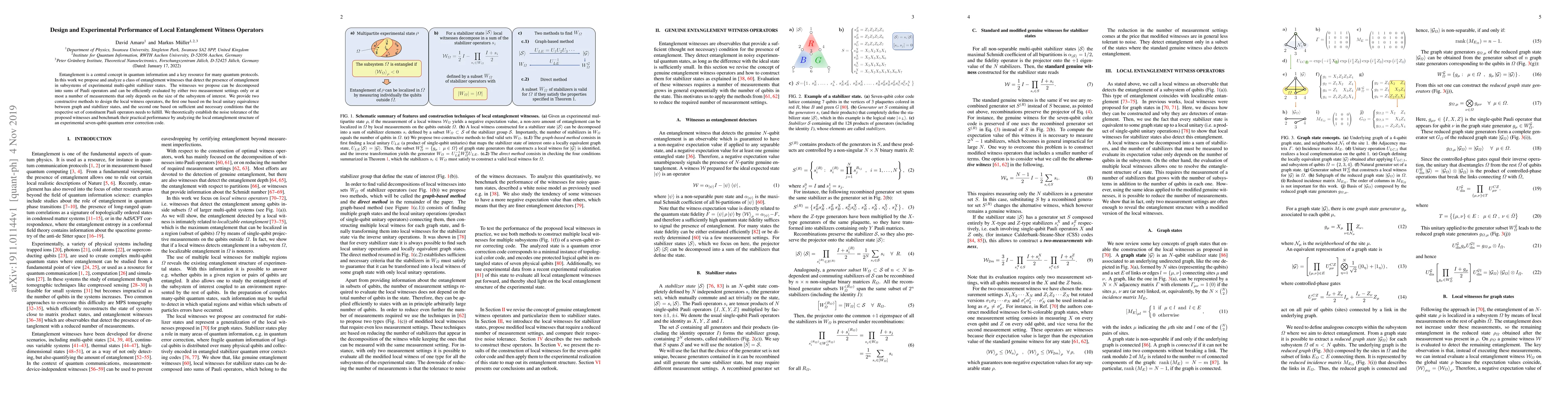 Entanglement is a central concept in quantum information and a key resource for many quantum protocols. In this work we propose and analyze a class of entanglement witnesses that detect the presence of entanglement in subsystems of experimental multi-qubit stabilizer states. The witnesses we propose can be decomposed into sums of Pauli operators and can be efficiently evaluated by either two measurement settings only or at most a number of measurements that only depends on the size of the subsystem of interest. We provide two constructive methods to design the local witness operators, the first one based on the local unitary equivalence between graph and stabilizer states, and the second one based on sufficient and necessary conditions that the respective set of constituent Pauli operators needs to fulfill. We theoretically establish the noise tolerance of the proposed witnesses and benchmark their practical performance by analyzing the local entanglement structure of an experimental seven-qubit quantum error correction code.