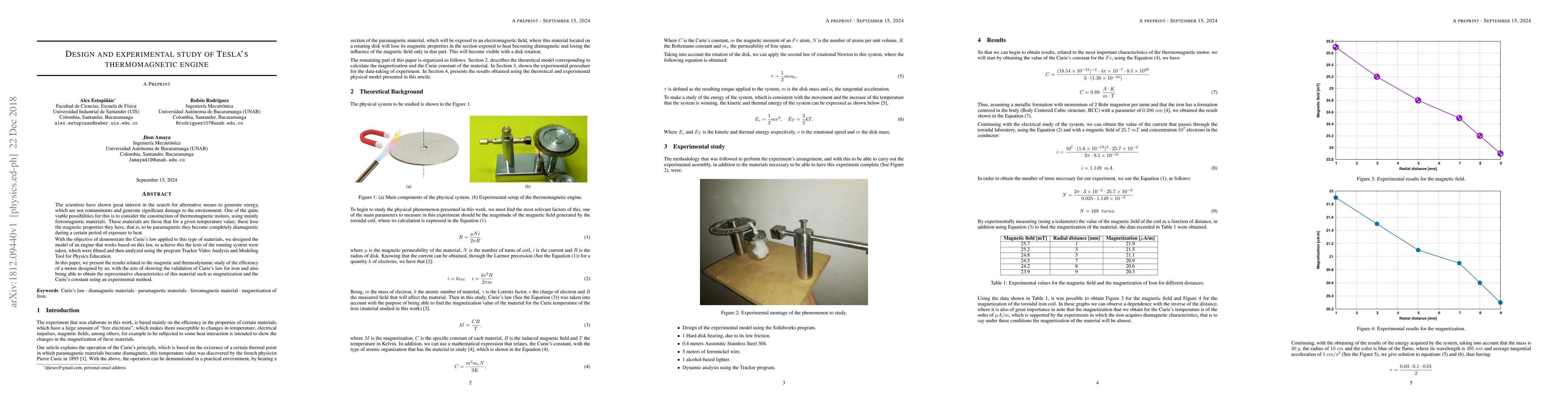The scientists have shown great interest in the search for alternative means to generate energy, which are not contaminants and generate significant damage to the environment. One of the quite viable possibilities for this is to consider the construction of thermomagnetic motors, using mainly ferromagnetic materials. These materials are those that for a given temperature value; these lose the magnetic properties they have, that is, to be paramagnetic they become completely diamagnetic during a certain period of exposure to heat. With the objective of demonstrate the Curie's law applied to this type of materials, we designed the model of an engine that works based on this law, to achieve this the tests of the running system were taken, which were filmed and then analyzed using the program Tracker Video Analysis and Modeling Tool for Physics Education. In this paper, we present the results related to the magnetic and thermodynamic study of the efficiency of a motor designed by us, with the aim of showing the validation of Curie's law for iron and also being able to obtain the representative characteristics of this material such as magnetization and the Curie's constant using an experimental method.