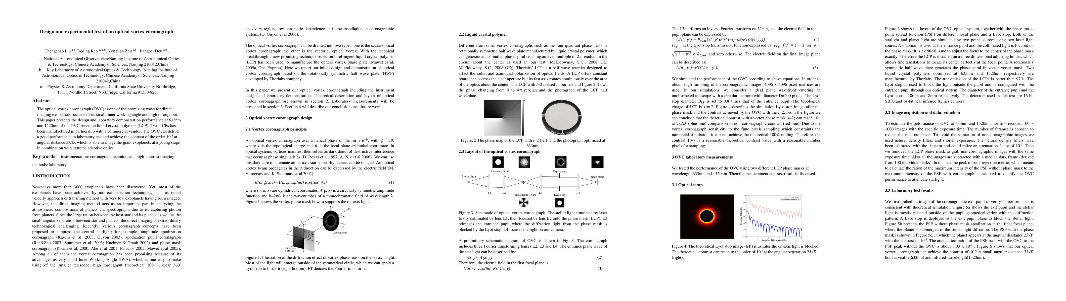 The paper details the design and experimental testing of an optical vortex coronagraph (OVC) made from liquid crystal polymers, demonstrating its effectiveness in achieving high contrast for exoplanet imaging at 633nm and 1520nm wavelengths. Laboratory tests show promising performance with a contrast level of 10^-6 at an angular distance of 3λ/D.