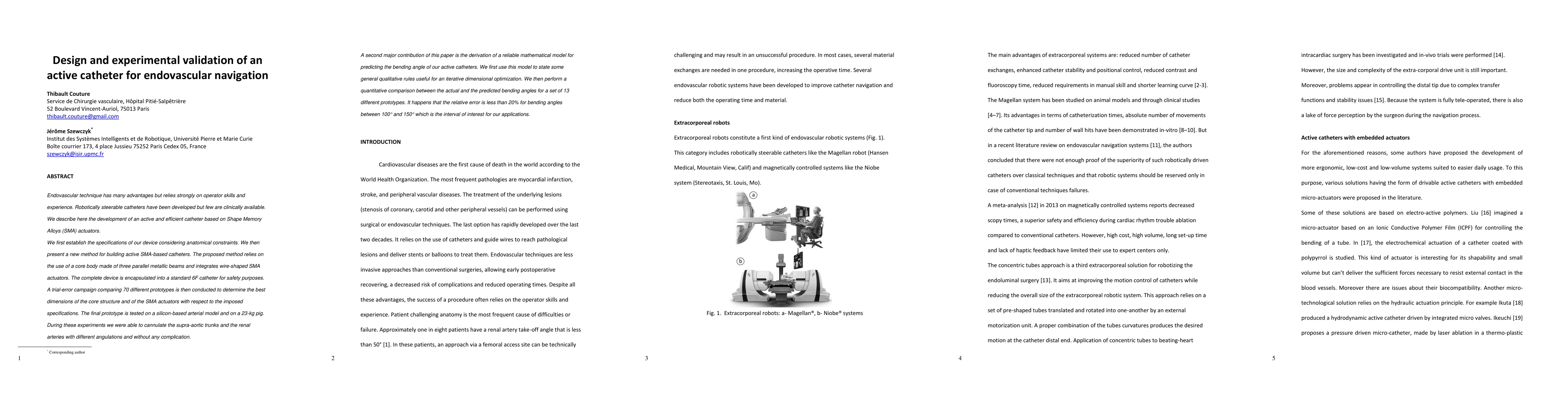 Endovascular technique has many advantages but relies strongly on operator skills and experience. Robotically steerable catheters have been developed but few are clinically available. We describe here the development of an active and efficient catheter based on Shape Memory Alloys (SMA) actuators. We first establish the specifications of our device considering anatomical constraints. We then present a new method for building active SMA-based catheters. The proposed method relies on the use of a core body made of three parallel metallic beams and integrates wire-shaped SMA actuators. The complete device is encapsulated into a standard 6F catheter for safety purposes. A trial-error campaign comparing 70 different prototypes is then conducted to determine the best dimensions of the core structure and of the SMA actuators with respect to the imposed specifications. The final prototype is tested on a silicon-based arterial model and on a 23-kg pig. During these experiments we were able to cannulate the supra-aortic trunks and the renal arteries with different angulations and without any complication.