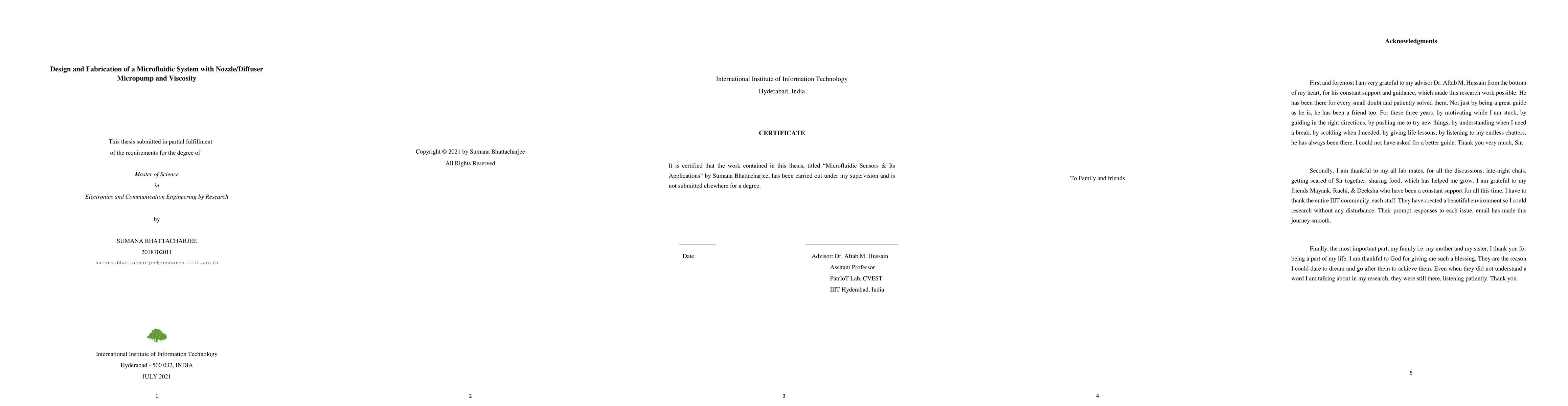 Micropumps are one of the most important parts of a microfluidic system. In particular, for biomedical applications such as Lab-on-Chip systems, micropumps are used to transport and manipulate test fluids in a controlled manner. In this work, a low-cost, structurally simple, piezoelectrically actuated micropump was simulated and fabricated using poly-dimethylsiloxane (PDMS). The channels in PDMS were fabricated using patterned SU-8 structures. The pump flow rate was measured to be 9.49 uL/min, 14.06 uL/min, 20.87 uL/min for applied voltages of 12 V, 14 V, 16 V respectively. Further, we report finite element analysis (FEA) simulation to confirm the operation of the micropump and compare favorably the experimentally obtained flowrate with the one predicted by simulation. By taking these flow rates as a reference, the chamber pressure was found to be 1.1 to 1.5 kPa from FEA simulations. Viscosity measurement has wide-ranging applications from the oil industry to the pharmaceutical industry. This work provides an elaborate mathematical model and study of measurement of viscosity in real-time using pressure sensors. For a given flowrate, a change in liquid viscosity gives rise to a change in pressure difference across a particular section of the pipe. Hence, by recording the pressure change, viscosity can be calculated dynamically. Mathematical modeling as well as finite element analysis (FEA) modeling has been presented. A set of pressure sensors were placed at a fixed distance from each other to get the real-time pressure change. Knowing the flow rate in the channel, the viscosity has been calculated from the pressure difference. For the finite element analysis, the pressure sensors were placed 60 mm away from each other. A different ratio of the mixture of water and glycerol was used to provide variable viscosity, which led to the variation in pressure-difference values.