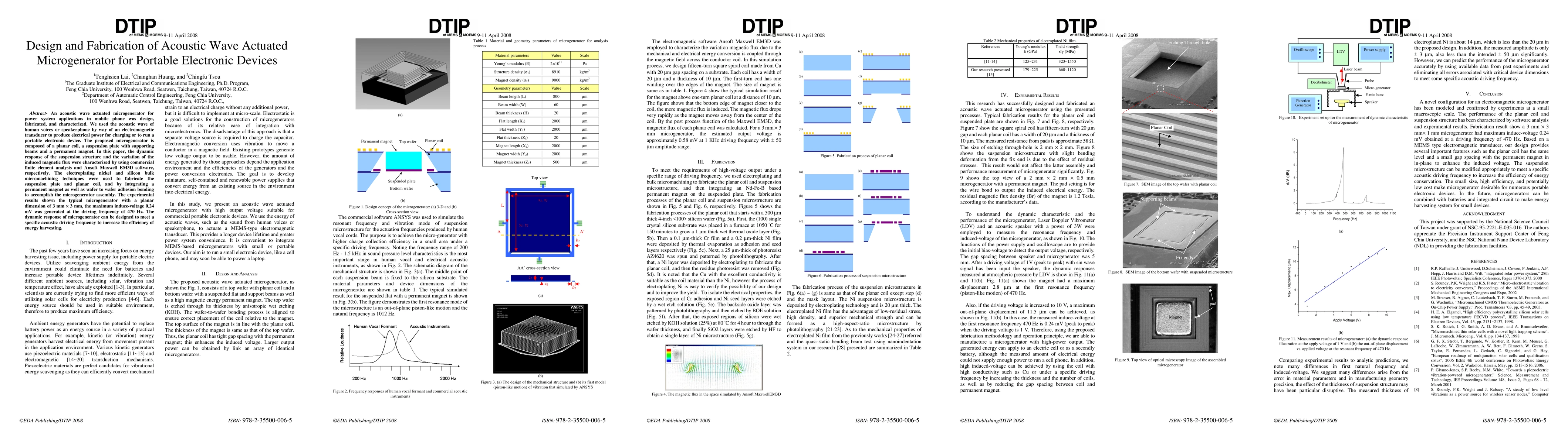 The past few years have seen an increasing focus on energy harvesting issue, including power supply for portable electric devices. Utilize scavenging ambient energy from the environment could eliminate the need for batteries and increase portable device lifetimes indefinitely. In addition, through MEMS technology fabricated micro-generator could easy integrate with these small or portable devices. Several different ambient sources, including solar, vibration and temperature effect, have already exploited [1-3]. Each energy source should be used in suitable environment, therefore to produce maximum efficiency. In this paper, we present an acoustic wave actuated micro-generator for power system by using the energy of acoustic waves, such as the sound from human voices or speakerphone, to actuate a MEMS-type electromagnetic transducer. This provides a longer device lifetime and greater power system convenience. Moreover, it is convenient to integrate MEMS-based microgenerators with small or porta le devices