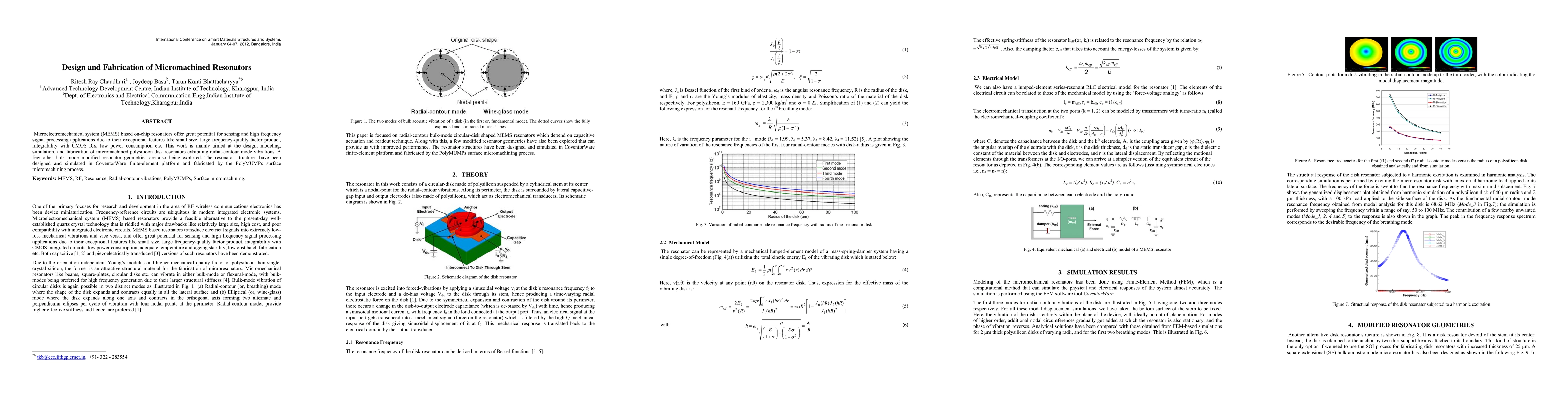 Microelectromechanical system (MEMS) based on-chip resonators offer great potential for sensing and high frequency signal processing applications due to their exceptional features like small size, large frequency-quality factor product, integrability with CMOS ICs, low power consumption etc. This work is mainly aimed at the design, modeling, simulation, and fabrication of micromachined polysilicon disk resonators exhibiting radial-contour mode vibrations. A few other bulk mode modified resonator geometries are also being explored. The resonator structures have been designed and simulated in CoventorWare finite-element platform and fabricated by the PolyMUMPs surface micromachining process.