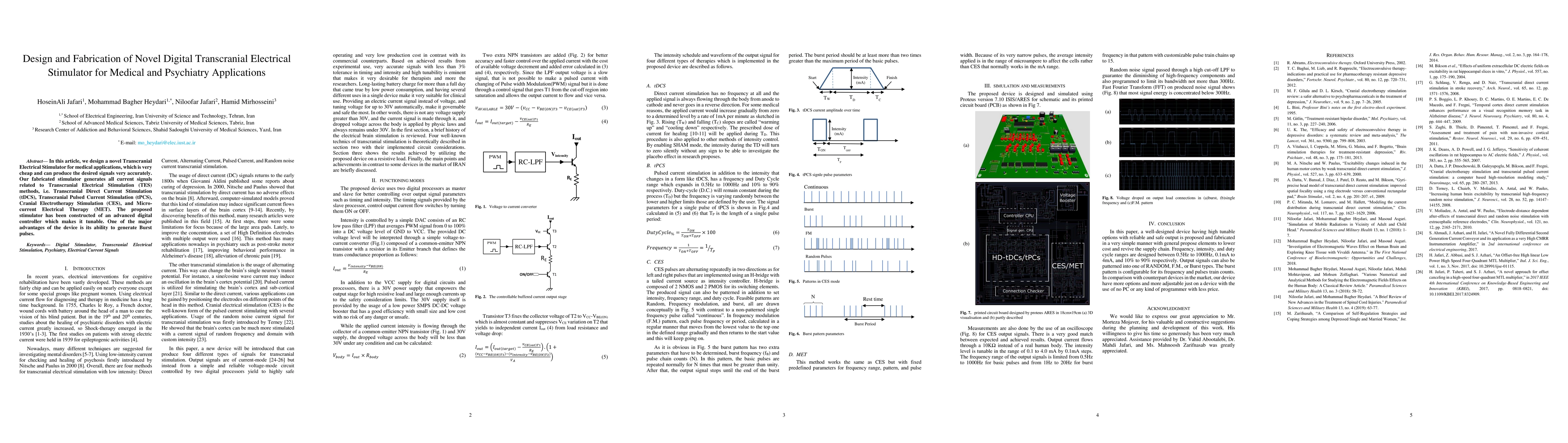 In this article, we design a novel Transcranial Electrical Stimulator for medical applications, which is very cheap and can produce the desired signals very accurately. Our fabricated stimulator generates all current signals related to Transcranial Electrical Stimulation (TES) methods, i.e. Transcranial Direct Current Stimulation (tDCS), Transcranial Pulsed Current Stimulation (tPCS), Cranial Electrotherapy Stimulation (CES), and Microcurrent Electrical Therapy (MET). The proposed device has been constructed of an advanced digital controller which makes it tunable. One of the major advantages of the device is its ability to generate Burst pulses.