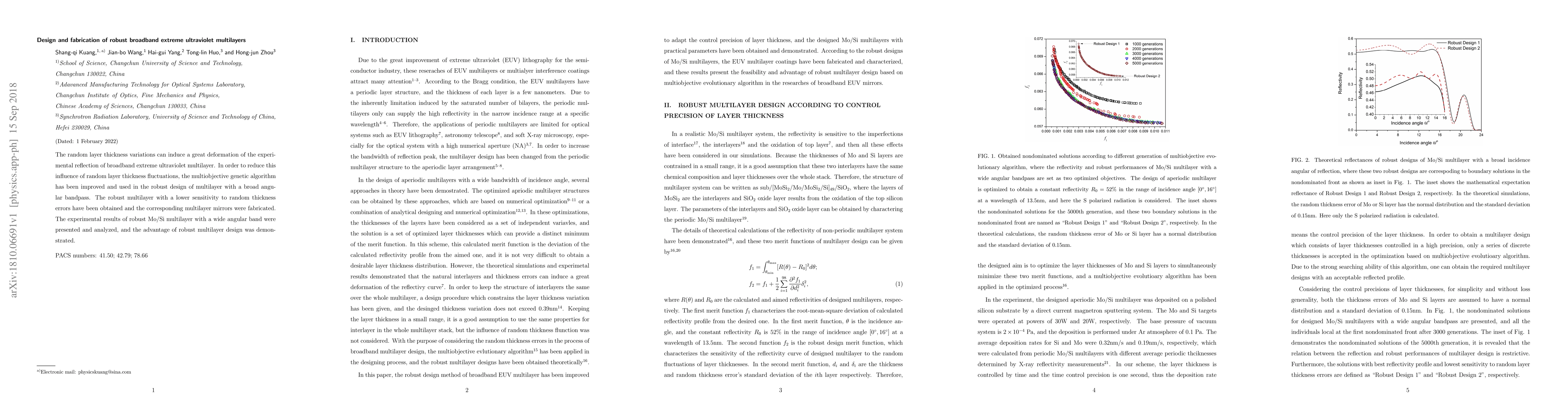The random layer thickness variations can induce a great deformation of the experimental reflection of broadband extreme ultraviolet multilayer. In order to reduce this influence of random layer thickness fluctuations, the multiobjective genetic algorithm has been improved and used in the robust design of multilayer with a broad angular bandpass. The robust multilayer with a lower sensitivity to random thickness errors have been obtained and the corresponding multilayer mirrors were fabricated. The experimental results of robust Mo/Si multilayer with a wide angular band were presented and analyzed, and the advantage of robust multilayer design was demonstrated.