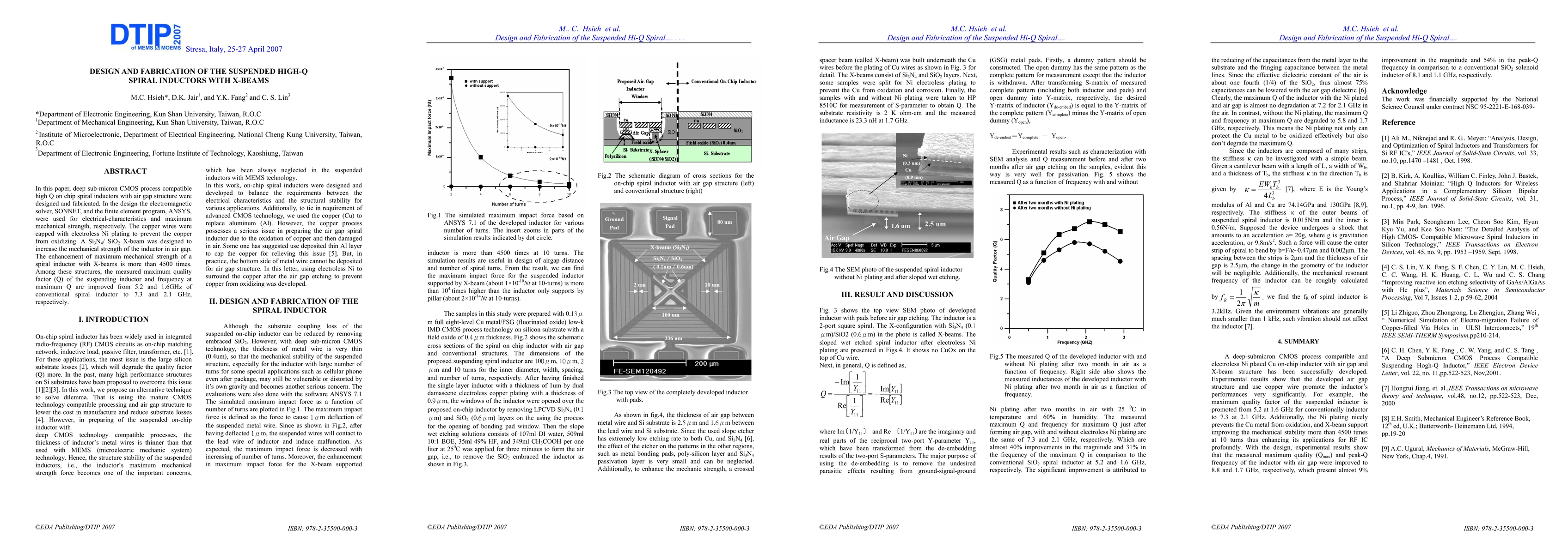 In this paper, deep sub-micron CMOS process compatible high Q on chip spiral inductors with air gap structure were designed and fabricated. In the design the electromagnetic were used for electrical-characteristics and maximum mechanical strength, respectively. The copper wires were capped with electroless Ni plating to prevent the copper from oxidizing. A Si3N4/ SiO2 X-beam was designed to increase the mechanical strength of the inductor in air gap. The enhancement of maximum mechanical strength of a spiral inductor with X-beams is more than 4500 times. Among these structures, the measured maximum quality factor (Q) of the suspending inductor and frequency at maximum Q are improved from 5.2 and 1.6GHz of conventional spiral inductor to 7.3 and 2.1 GHz, respectively.