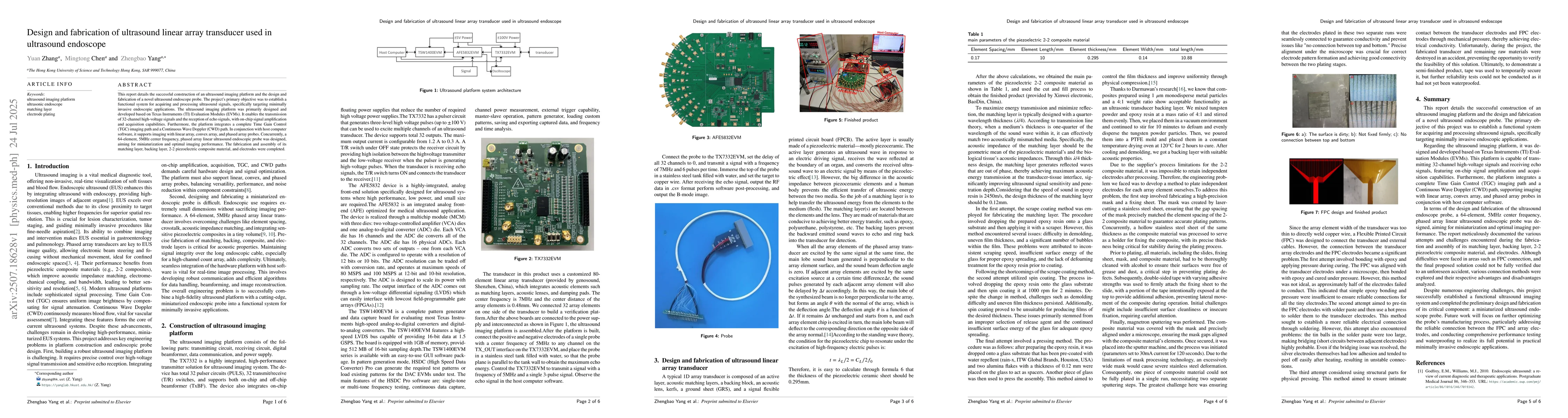 This report details the successful construction of an ultrasound imaging platform and the design and fabrication of a novel ultrasound endoscope probe. The projects primary objective was to establish a functional system for acquiring and processing ultrasound signals, specifically targeting minimally invasive endoscopic applications. The ultrasound imaging platform was primarily designed and developed based on Texas Instruments (TI) Evaluation Modules (EVMs). It enables the transmission of 32-channel high-voltage signals and the reception of echo signals, with on-chip signal amplification and acquisition capabilities. Furthermore, the platform integrates a complete Time Gain Control (TGC) imaging path and a ContinuousWave Doppler (CWD) path. In conjunction with host computer software, it supports imaging with linear array, convex array, and phased array probes. Concurrently, a 64-element, 5MHz center frequency, phased array linear ultrasound endoscopic probe was designed, aiming for miniaturization and optimal imaging performance. The fabrication and assembly of its matching layer, backing layer, 2-2 piezoelectric composite material, and electrodes were completed.