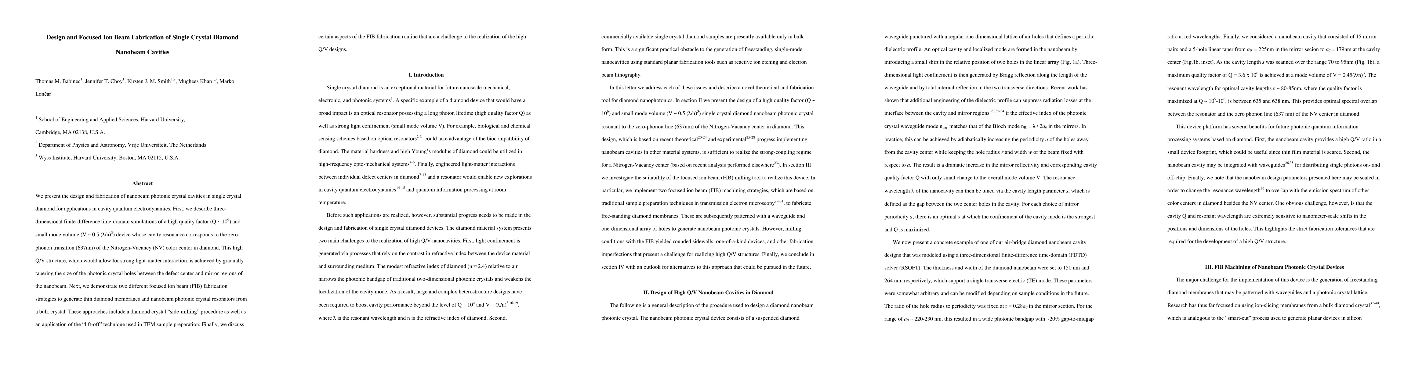 This paper details the design and fabrication of high-quality, low-volume photonic crystal cavities in single crystal diamond for cavity quantum electrodynamics applications. The study utilizes focused ion beam techniques to create thin membranes and nanobeam structures, though it identifies challenges in achieving optimal quality factor and mode volume.