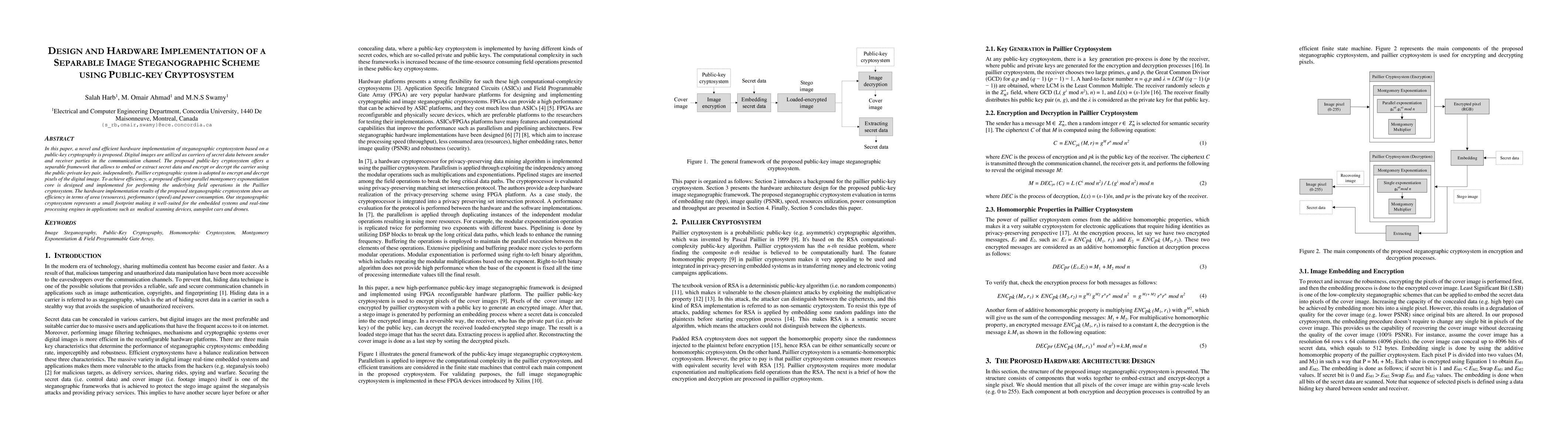 This paper proposes a hardware implementation of a separable image steganographic scheme using a public-key cryptosystem based on the Paillier algorithm. The design features a parallel montgomery exponentiation core for efficient field operations, demonstrating good performance in terms of area, speed, and power consumption.