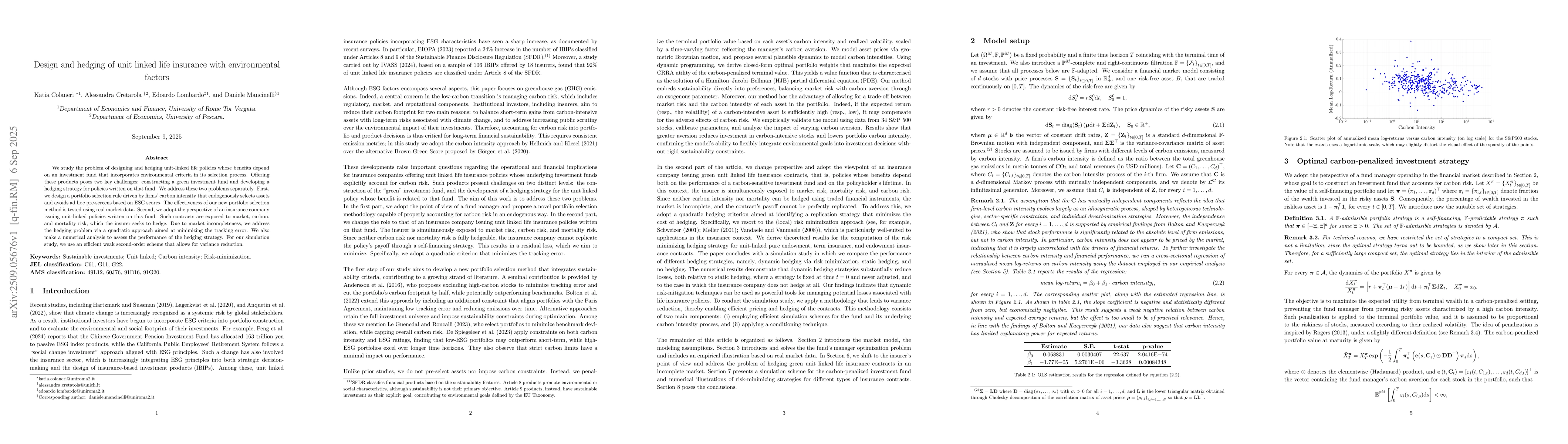 We study the problem of designing and hedging unit-linked life policies whose benefits depend on an investment fund that incorporates environmental criteria in its selection process. Offering these products poses two key challenges: constructing a green investment fund and developing a hedging strategy for policies written on that fund. We address these two problems separately. First, we design a portfolio selection rule driven by firms' carbon intensity that endogenously selects assets and avoids ad hoc pre-screens based on ESG scores. The effectiveness of our new portfolio selection method is tested using real market data. Second, we adopt the perspective of an insurance company issuing unit-linked policies written on this fund. Such contracts are exposed to market, carbon, and mortality risk, which the insurer seeks to hedge. Due to market incompleteness, we address the hedging problem via a quadratic approach aimed at minimizing the tracking error. We also make a numerical analysis to assess the performance of the hedging strategy. For our simulation study, we use an efficient weak second-order scheme that allows for variance reduction.