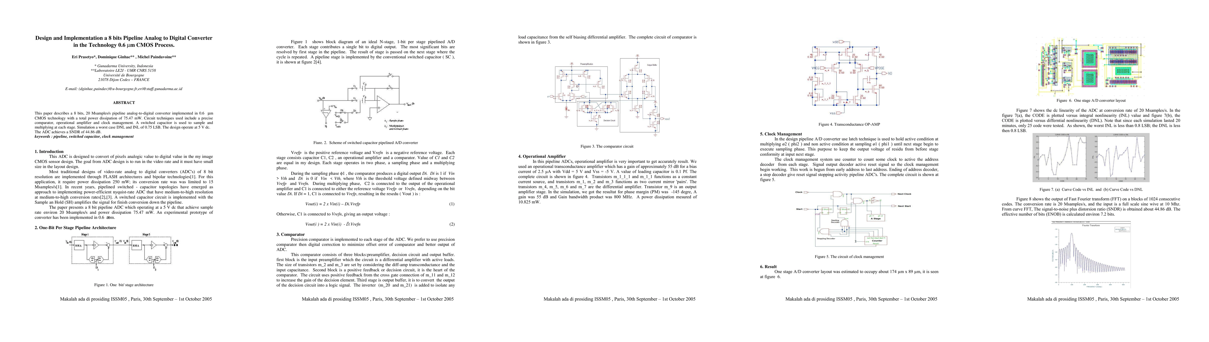 This paper describes a 8 bits, 20 Msamples/s pipeline analog-to-digital converter implemented in 0.6 \mu m CMOS technology with a total power dissipation of 75.47 mW. Circuit techniques used include a precise comparator, operational amplifier and clock management. A switched capacitor is used to sample and multiplying at each stage. Simulation a worst case DNL and INL of 0.75 LSB. The design operate at 5 V dc. The ADC achieves a SNDR of 44.86 dB. keywords : pipeline, switched capacitor, clock management