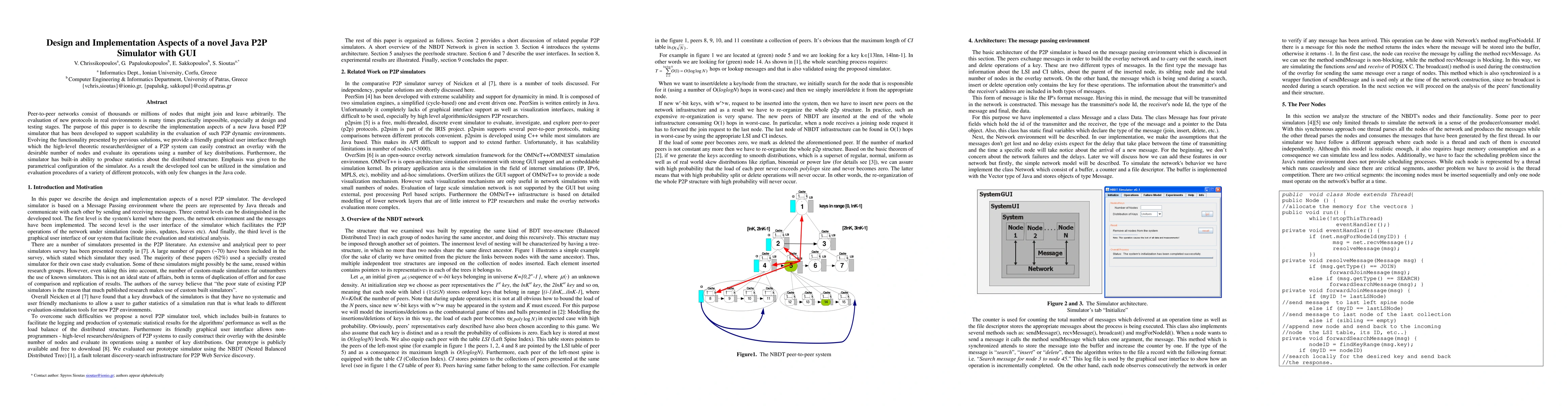 Peer-to-peer networks consist of thousands or millions of nodes that might join and leave arbitrarily. The evaluation of new protocols in real environments is many times practically impossible, especially at design and testing stages. The purpose of this paper is to describe the implementation aspects of a new Java based P2P simulator that has been developed to support scalability in the evaluation of such P2P dynamic environments. Evolving the functionality presented by previous solutions, we provide a friendly graphical user interface through which the high-level theoretic researcher/designer of a P2P system can easily construct an overlay with the desirable number of nodes and evaluate its operations using a number of key distributions. Furthermore, the simulator has built-in ability to produce statistics about the distributed structure. Emphasis was given to the parametrical configuration of the simulator. As a result the developed tool can be utilized in the simulation and evaluation procedures of a variety of different protocols, with only few changes in the Java code.