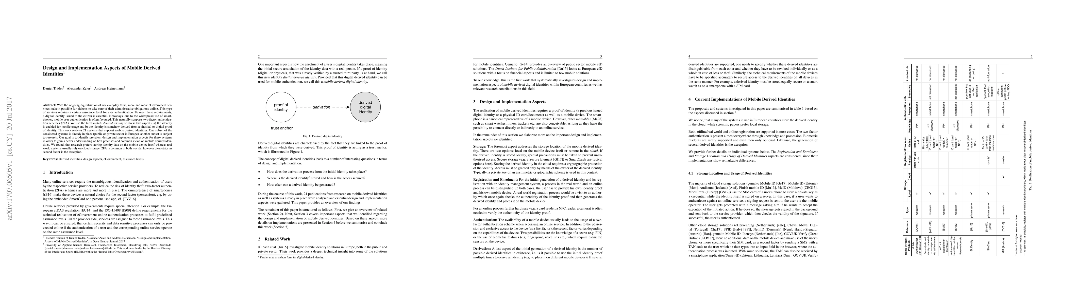 This paper reviews 21 systems supporting mobile derived identities, emphasizing their design and implementation aspects. It finds that research often stores identity data locally on mobile devices while real-world systems prefer cloud storage, with two-factor authentication being common but biometrics rarely used as the second factor.
