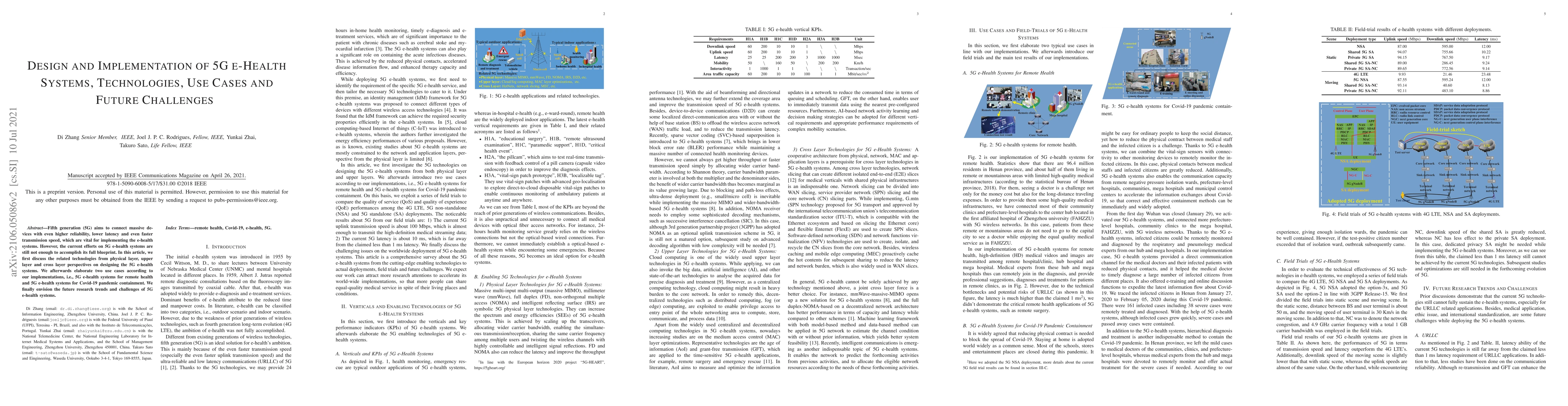 Fifth generation (5G) aims to connect massive devices with even higher reliability, lower latency and even faster transmission speed, which are vital for implementing the e-health systems. However, the current efforts on 5G e-health systems are still not enough to accomplish its full blueprint. In this article, we first discuss the related technologies from physical layer, upper layer and cross layer perspectives on designing the 5G e-health systems. We afterwards elaborate two use cases according to our implementations, i.e., 5G e-health systems for remote health and 5G e-health systems for Covid-19 pandemic containment. We finally envision the future research trends and challenges of 5G e-health systems.