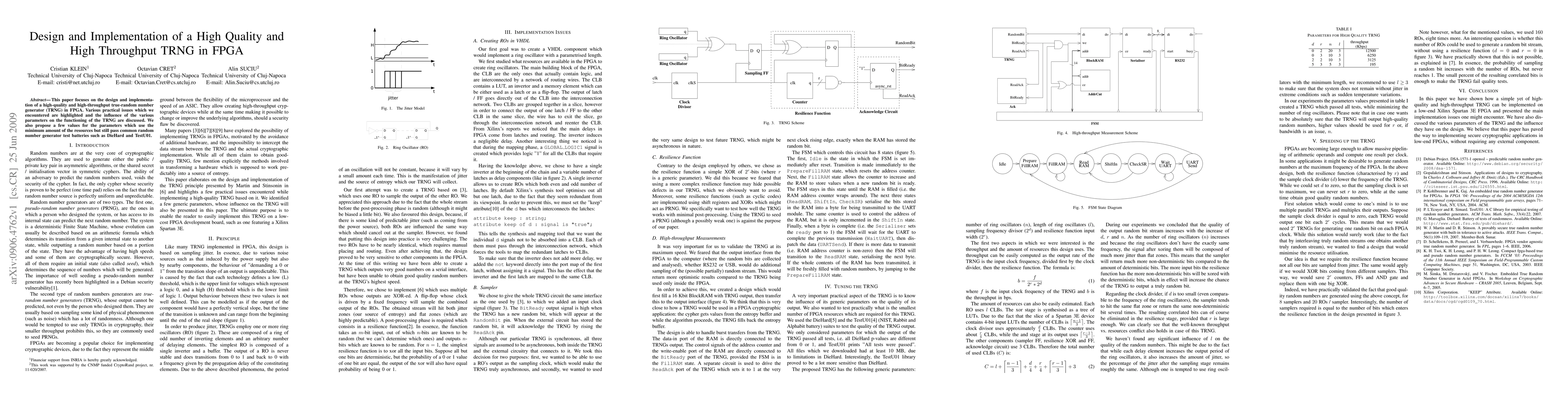 This paper presents a high-quality, high-throughput TRNG implemented in FPGA, addressing practical design issues and parameter influences. It proposes optimal parameter values that minimize resource usage while passing rigorous random number generator tests like DieHard and TestU01.