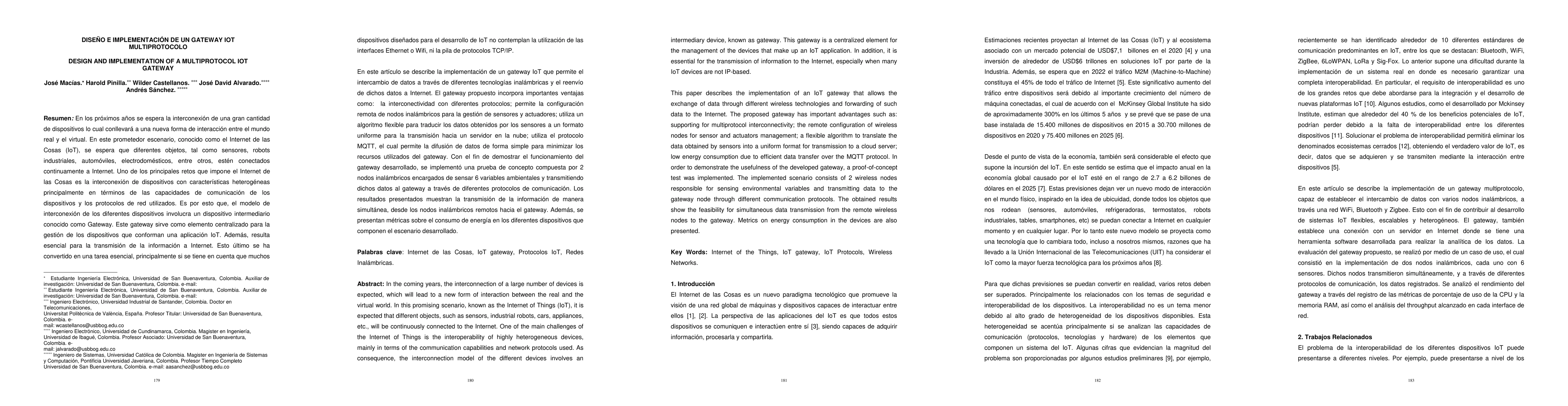 In the coming years, the interconnection of a large number of devices is expected, which will lead to a new form of interaction between the real and the virtual world. In this promising scenario, known as the Internet of Things, it is expected that different objects, such as sensors, industrial robots, cars, appliances, will be connected to the Internet. One of the main challenges of the Internet of Things is the interoperability of highly heterogeneous devices, mainly in terms of the communication capabilities and network protocols used. As consequence, the interconnection model of the different devices involves an intermediary device, known as gateway. This gateway is a centralized element for the management of the devices that make up an IoT application. In addition, it is essential for the transmission of information to the Internet, especially when many IoT devices are not IP-based. This paper describes the implementation of an IoT gateway that allows the exchange of data through different wireless technologies and forwarding of such data to the Internet. The proposed gateway has important advantages such as: supporting for multiprotocol interconnectivity; remote configuration of wireless nodes for sensor and actuators management; a flexible algorithm to translate the data obtained by sensors into a uniform format for transmission to a cloud server; low energy consumption due to efficient data transfer over the MQTT protocol. In order to demonstrate the usefulness of the developed gateway, a proof-of-concept test was implemented. The implemented scenario consists of 2 wireless nodes responsible for sensing environmental variables and transmitting data to the gateway node through different communication protocols. The obtained results show the feasibility for simultaneous data transmission from the remote wireless nodes to the gateway.