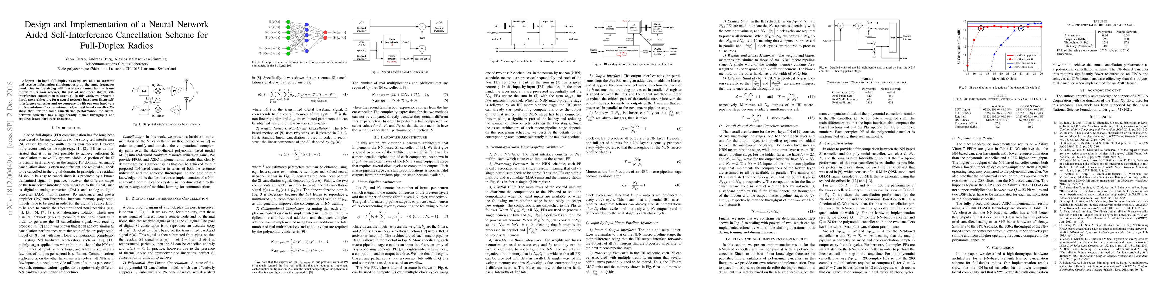 This paper presents a neural network-based self-interference cancellation scheme for full-duplex radios, demonstrating higher throughput and lower hardware resource requirements compared to a conventional polynomial-based canceller, while achieving similar cancellation performance.