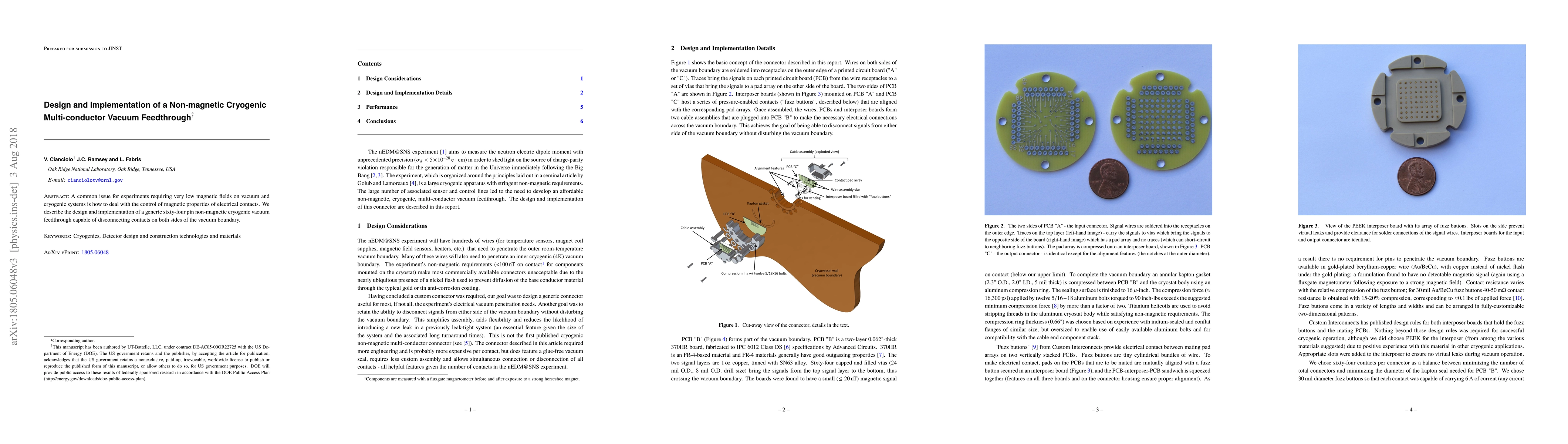 Summary: This paper details the design and construction of a sixty-four pin non-magnetic cryogenic vacuum feedthrough, emphasizing its suitability for low-temperature applications without magnetic interference. The implementation focuses on maintaining vacuum integrity while ensuring minimal thermal conduction.