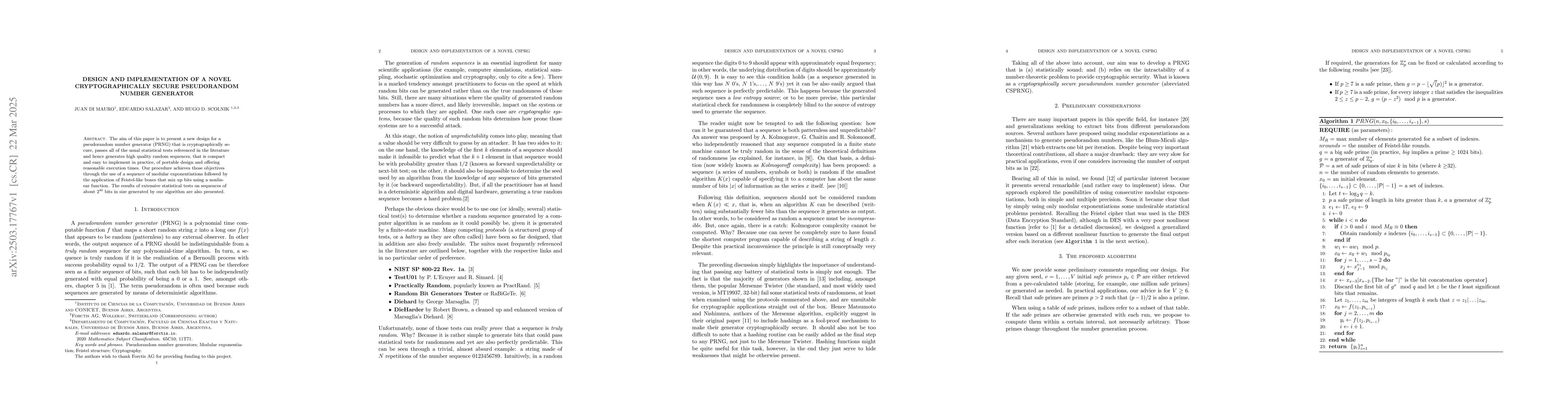 The paper presents a new PRNG design using modular exponentiations followed by Feistel-like boxes for bit-mixing via nonlinear functions.
