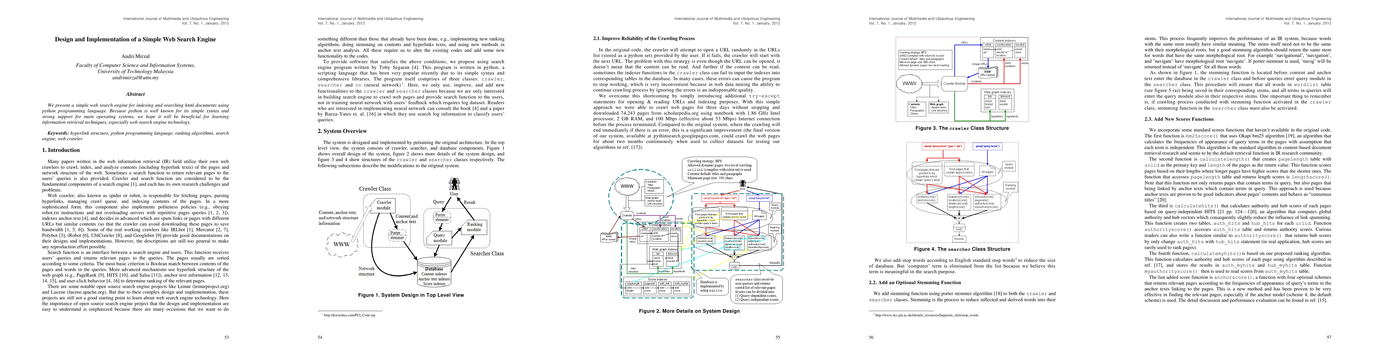 Summary: This paper designs and implements a straightforward web search engine using Python, aiming to facilitate learning information retrieval and web search technologies through its simple syntax and cross-platform support. The engine indexes and searches HTML documents efficiently.