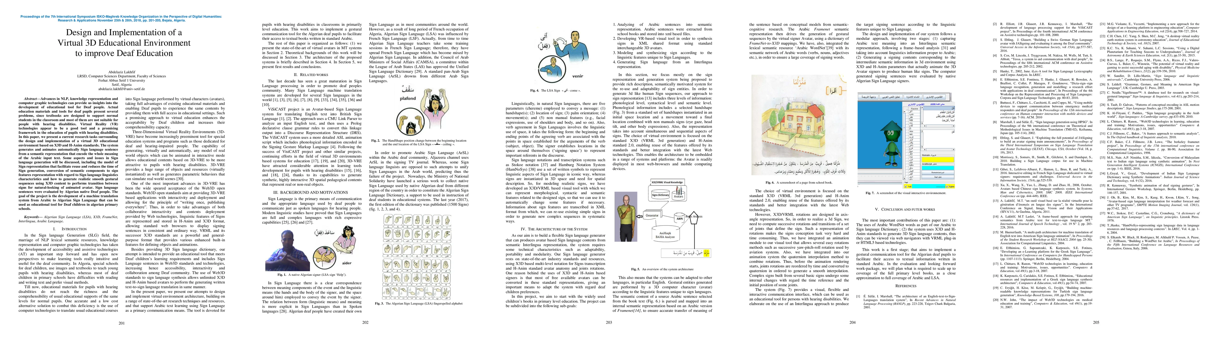 Advances in NLP, knowledge representation and computer graphic technologies can provide us insights into the development of educational tool for Deaf people. Actual education materials and tools for deaf pupils present several problems, since textbooks are designed to support normal students in the classroom and most of them are not suitable for people with hearing disabilities. Virtual Reality (VR) technologies appear to be a good tool and a promising framework in the education of pupils with hearing disabilities. In this paper, we present a current research tasks surrounding the design and implementation of a virtual 3D educational environment based on X3D and H-Anim standards. The system generates and animates automatically Sign language sentence from a semantic representation that encode the whole meaning of the Arabic input text. Some aspects and issues in Sign language generation will be discussed, including the model of Sign representation that facilitate reuse and reduces the time of Sign generation, conversion of semantic components to sign features representation with regard to Sign language linguistics characteristics and how to generate realistic smooth gestural sequences using X3D content to performs transition between signs for natural-looking of animated avatar. Sign language sentences were evaluated by Algerian native Deaf people. The goal of the project is the development of a machine translation system from Arabic to Algerian Sign Language that can be used as educational tool for Deaf children in algerian primary schools.