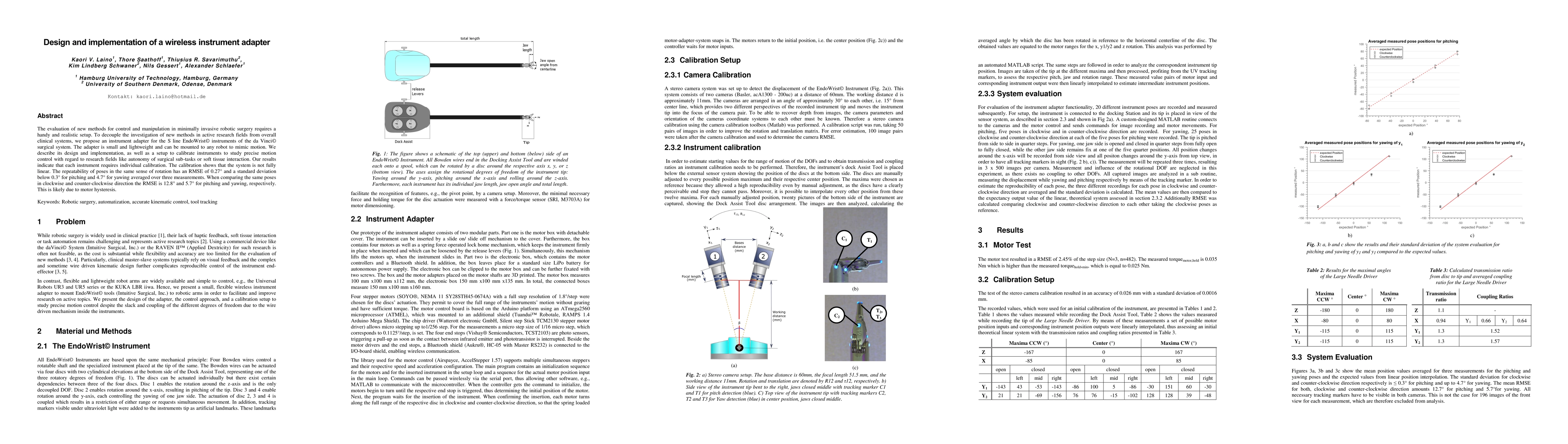 Researchers designed a wireless instrument adapter for robotic surgery to test precise motion control, finding that each instrument requires individual calibration and the system is not fully linear, with significant motor hysteresis effects.
