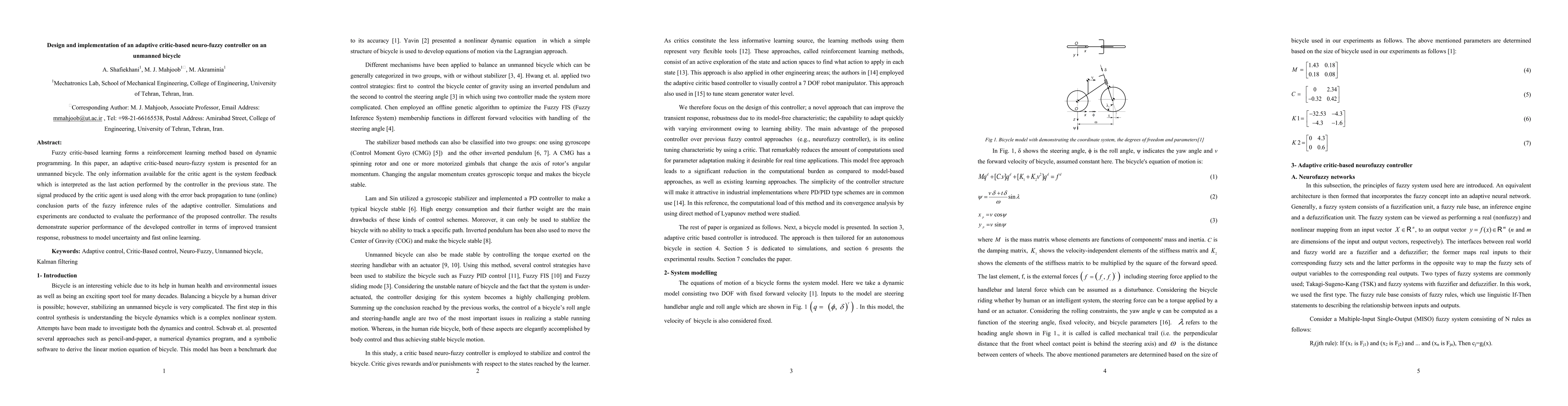 This paper presents an adaptive critic-based neuro-fuzzy controller for an unmanned bicycle, utilizing reinforcement learning and dynamic programming. The controller demonstrates superior performance through improved transient response, robustness, and fast online learning, as shown in simulations and experiments.