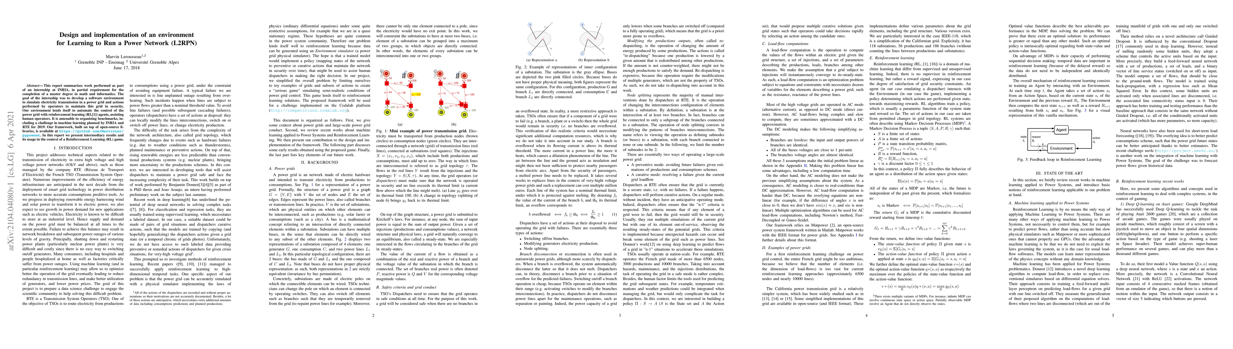 This research paper introduces an environment called L2RPN to simulate electricity transmission in power grids using reinforcement learning. It provides a framework for automating grid control with machine learning agents and is available for public use.
